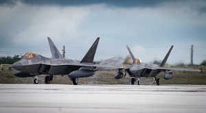 U.S. Air Force F-22 Raptors assigned to the 199th Fighter Squadron, 154th Wing, Joint Base Pearl Harbor Hickam, Hawaii, arrive in support of Pacific Iron 2021 at Andersen Air Force Base, Guam, July 18, 2021. Pacific Iron 2021 is a Pacific Air Forces dynamic force employment operation to project