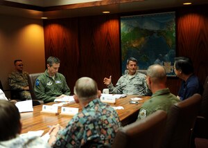 Lt. Gen. Russell J. Handy receives his initial briefing as the Pacific Air Forces commander and U.S Pacific Command Joint Force Air Component commander, May 9 at Joint Base Pearl Harbor-Hickam, Hawaii. Effective May 10, Gen. Handy, the 11th Air Force commander, will serve as the PACAF and USPACOM