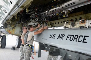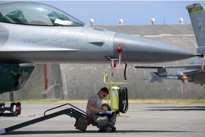 U.S. Air Force Senior Airman Ryan Banneau, 158th Fighter Wing F-16 Fighting Falcon crew chief, fills out a checklist in the shade of an F-16 on Kadena Air Base, Japan, July 16, 2015. The 158th Fighter Wing of Vermont is currently deployed to Kadena as part of a Pacific Command Theater Security