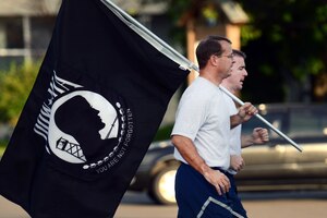Airmen yell across a field for teammates to move from barrier to barrier, returning fire while their patrol is caught in a firefight during a Shoot, Move, Communicate training course here Sept. 6. Shoot, Move, Communicate tests security forces members' ability to communicate with their teammates