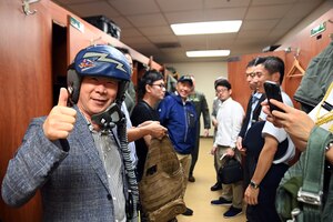 Members of the Research Institute for Indo-Pacific Affairs try on aircrew flight equipment during a visit to Osan Air Base, Republic of Korea, July 18, 2023. Goals of RIIPA include contributing to the stability, peace and prosperity of the Indo-Pacific region and strengthening community values