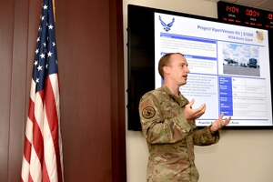 U.S. Air Force Maj. Raymond Hill, Pacific Air Forces Innovation Lead, pitches his idea to 15th Wing leadership during the inaugural 15th Wing Spark Tank competition on Joint Base Pearl Harbor-Hickam, Hawaii, April 28, 2023. The Spark Tank competition gives the warfighter an opportunity to present