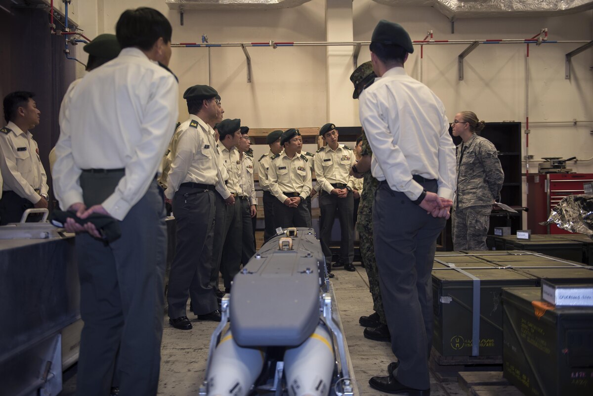 U.S. Air Force Senior Airman Mollye Voorhees, 18th Munitions Squadron (MUNS) conventional maintenance crew member, and Floyd Higa, 18th MUNS chief master labor contractor, show members of the Japan Ground Self-Defense Force (JGSDF) different pieces of munitions equipment during a tour at Kadena Air Base, Japan, Jan. 11, 2017. The JGSDF members are training to become logistics officers and are touring U.S. munitions storage units to get an understanding of how they operate in an effort to stregthen ties between the U.S. and Japan. (U.S. Air Force photo by Airman 1st Class Corey Pettis/Released)