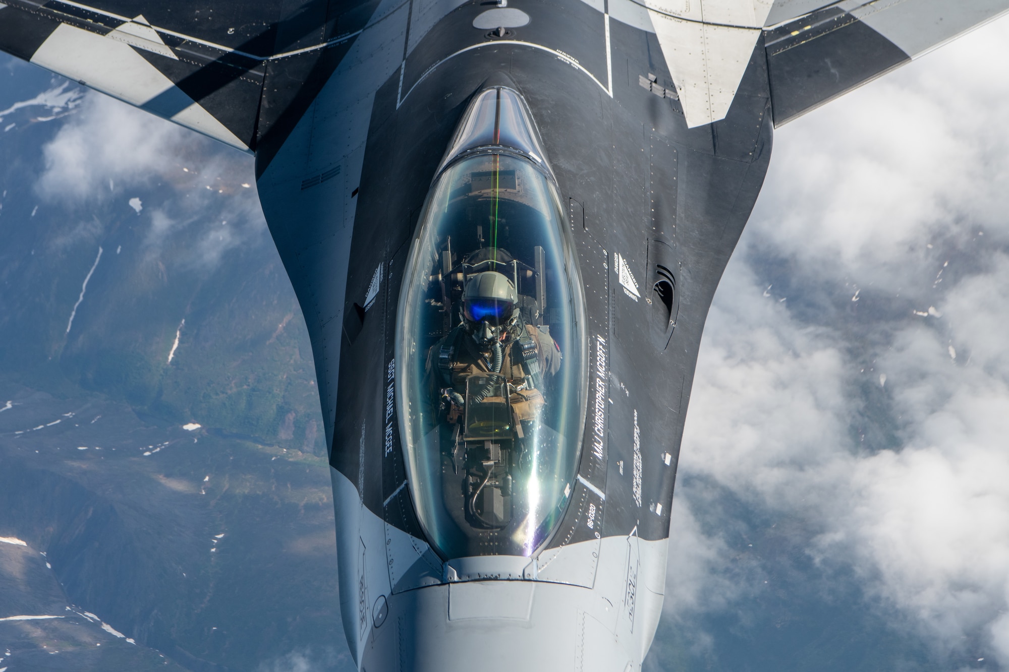 JOINT BASE ELMENDORF-RICHARDSON, Alaska -- U.S. Air Force F-16 Fighting Falcons, assigned to the 18th Aggressor Squadron, Eielson Air Force Base, receives fuel from a 92nd Air Refueling Wing KC-135 Stratotanker above the Joint Pacific Alaska Range Complex during a training sortie for RED FLAG-Alaska 22-2, June 22, 2022.