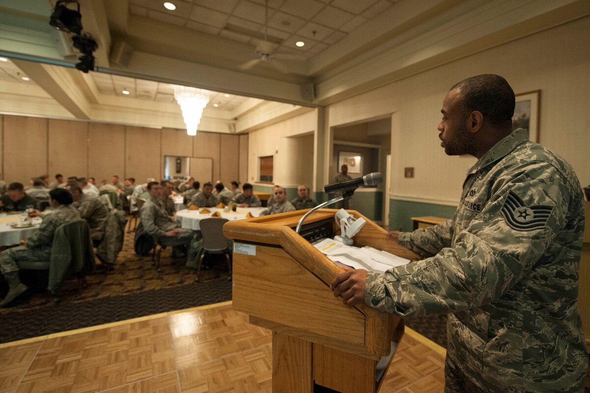 Chief Master Sgt. Nanette Klingaman, 8th Security Forces Squadron manager, speaks to Wolf Pack Airmen during the Dr. Martin Luther King Jr. Day luncheon Jan. 16, 2015, at Kunsan Air Base, Republic of Korea. Klingaman, Kunsan's first female security forces chief master sergeant, was the guest speaker at the event. (U.S. Air Force photo by Senior Airman Katrina Heikkinen/Released)