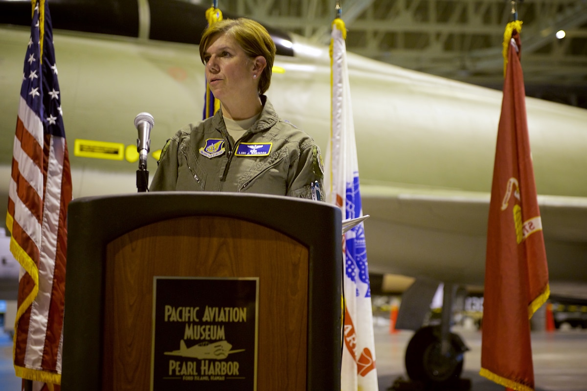 U.S. Air Force Gen. Lori J. Robinson, Pacific Air Forces commander, speaks during an F-100F Super Sabre aircraft dedication ceremony, Ford Island, Hawaii, Oct. 30, 2014. The F-100F is a two-seat supersonic jet fighter used extensively by forward air controls during the Vietnam War. The FACs, famously known by their call sign Misty, used specialized tactics and the fast F-100F to locate and mark targets for other aircraft to hit. This F-100F was recently acquired and restored prior to its dedication at the Pacific Aviation Museum. (U.S. Air Force by photo by Tech. Sgt. James Stewart/Released)
