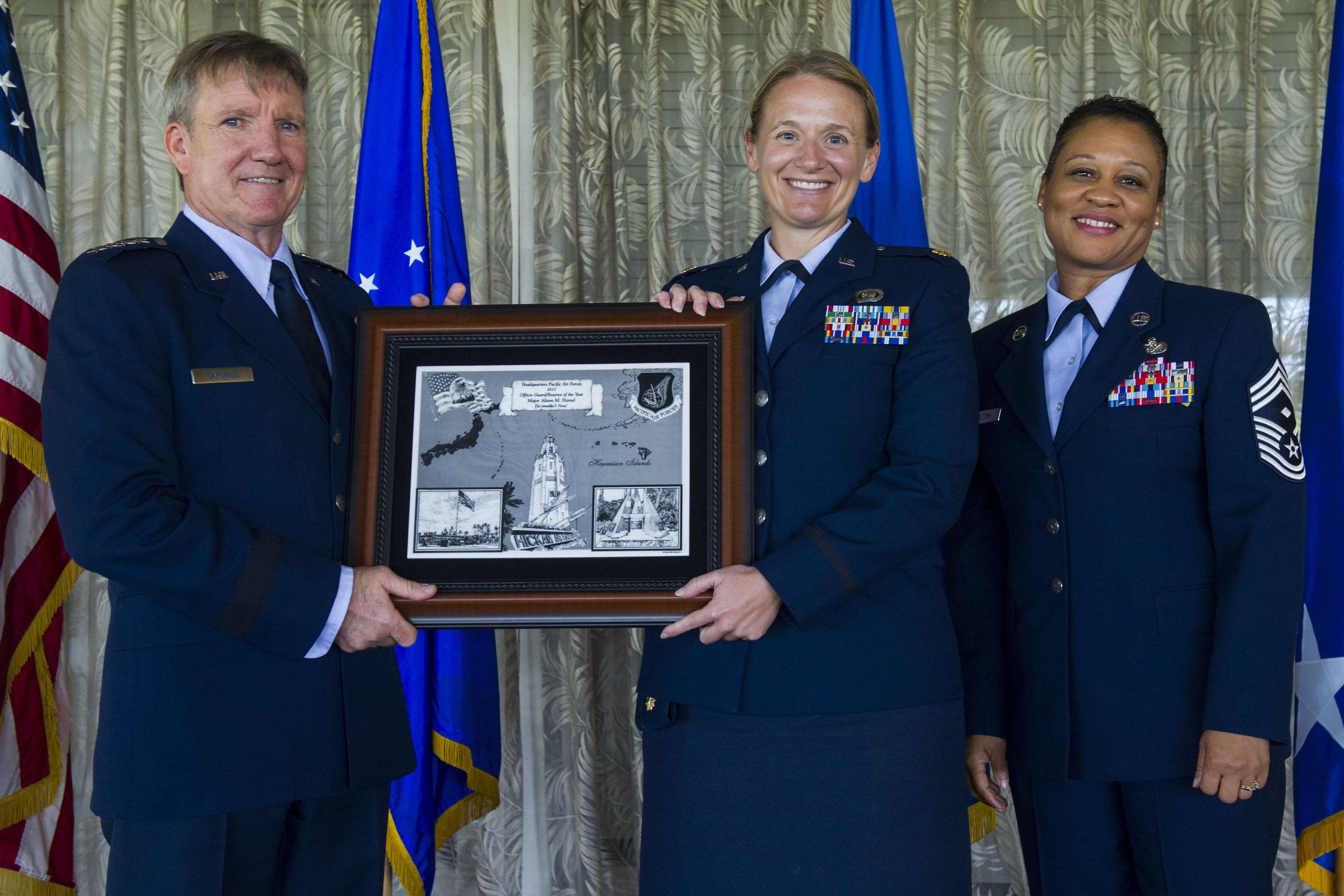 (Left) Gen. Hawk Carlisle, Pacific Air Forces commander, and (right) Chief Master Sgt. Rita Felton, Headquarters PACAF 1st Sgt., present the 2013 Headquarters PACAF Reserve/Guard Officer of the Year award to Maj. Alison Hamel, 713th Combat Operations Squadron A2 Intelligence Officer at the 2013 PACAF Annual Awards banquet Feb. 25, 2014. Hamel was also named the 2013 PACAF/A2 Air Force Intelligence, Surveillance & Reconnaissance Awards Program Reserve Officer of the Year. (U.S. Air Force photo by Staff Sgt. Nathaniel Allen)