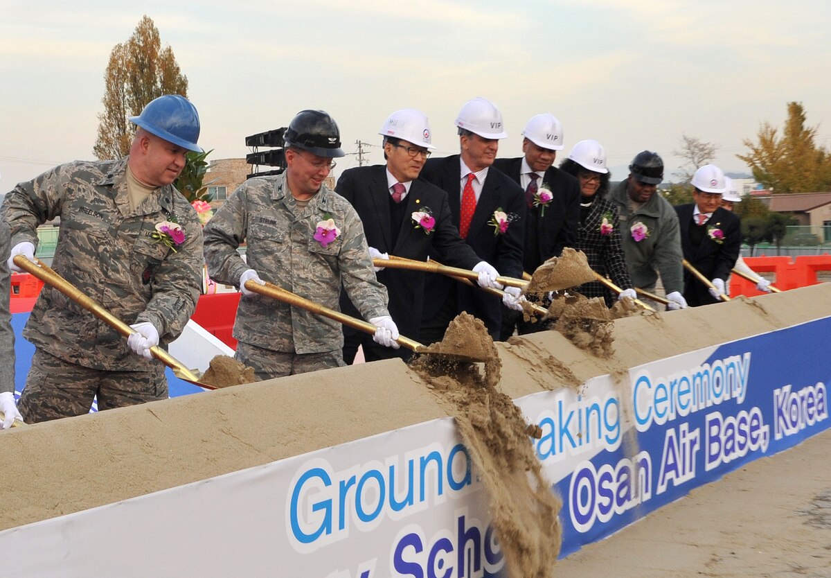 Special guests from the 51st Mission Support Group, Osan American Elementary School, U.S. Army Corps of Engineers, the South Korea District Office and ILSUNG Construction Co., Ltd., listen to guest speakers discuss plans for the new elementary school during a groundbreaking ceremony at Osan Air Base, Republic of Korea, Nov. 13, 2013. The notice to proceed with construction was given last month, and the building is slated to be operational in March 2016. (U.S. Air Force photo/Airman 1st Class Ashley J. Thum)