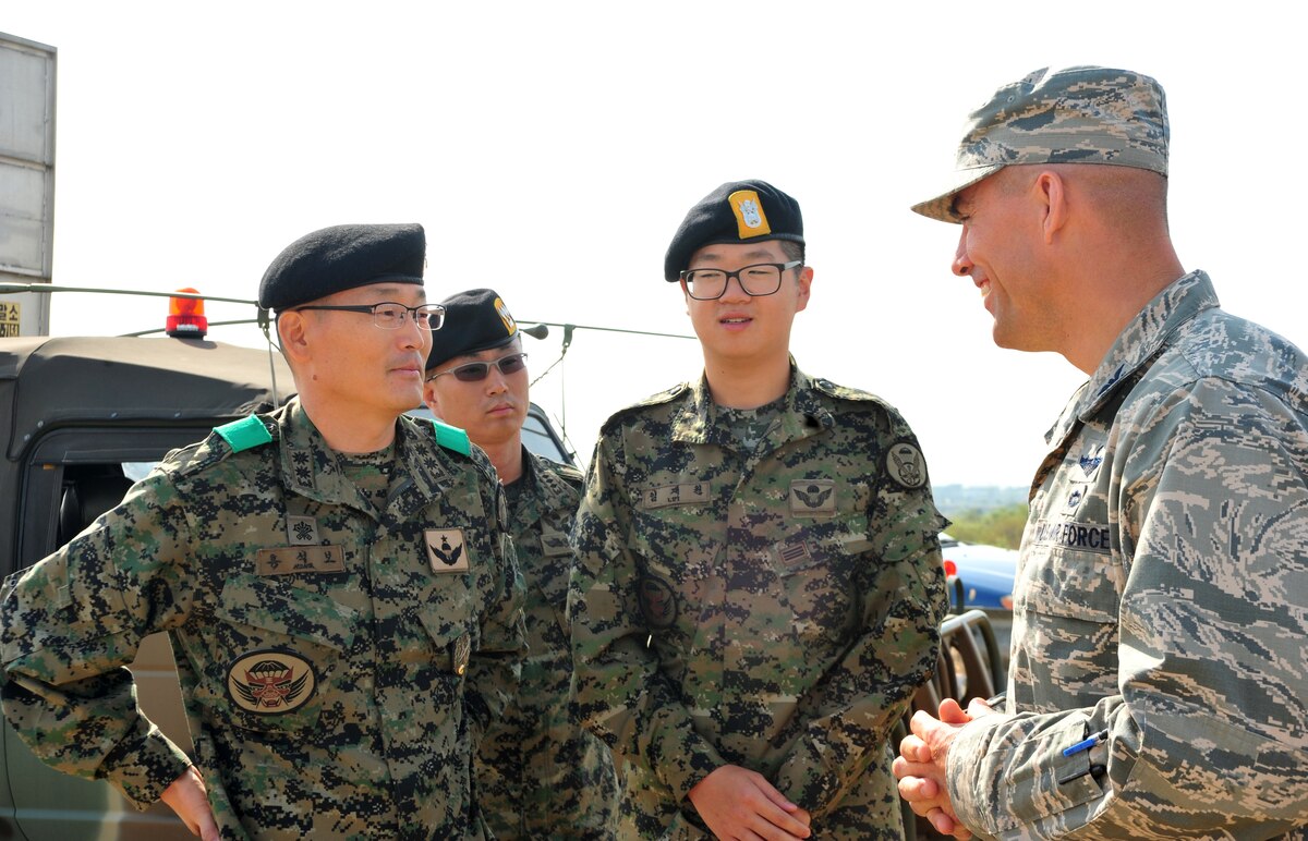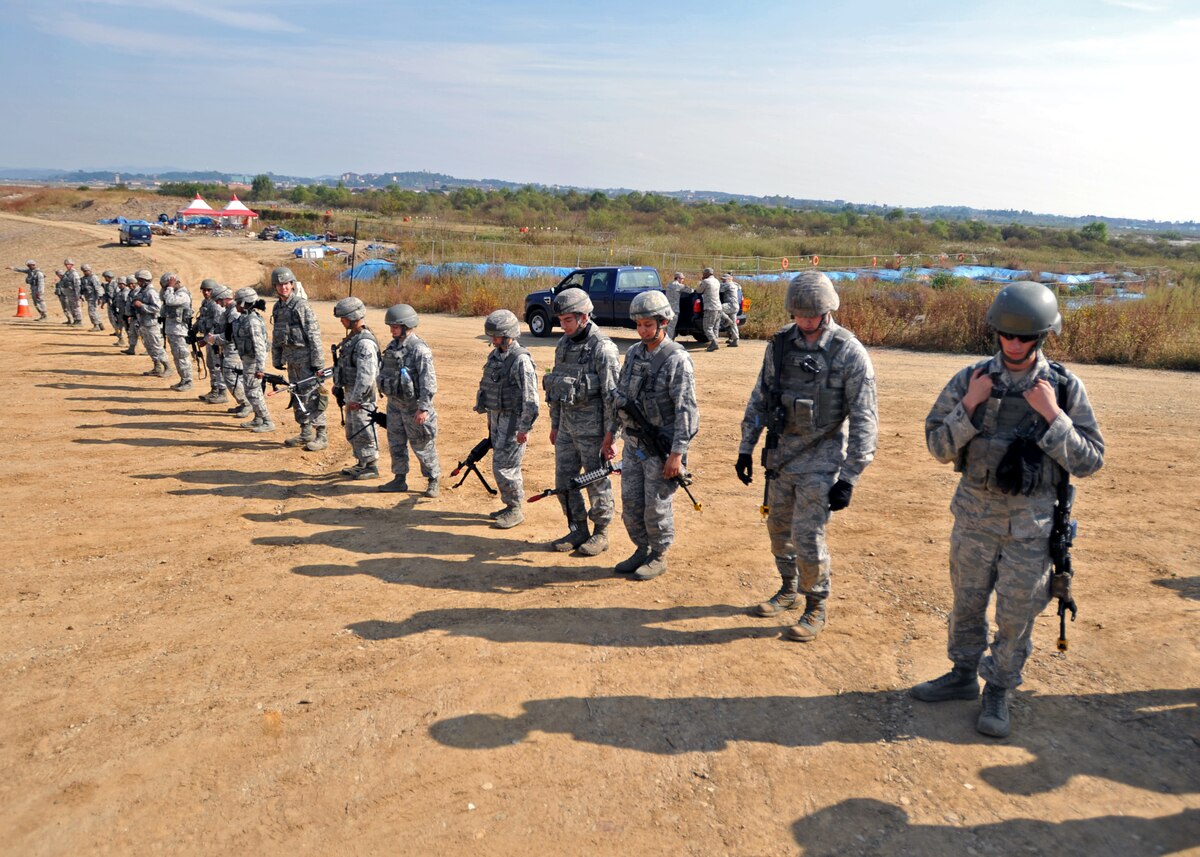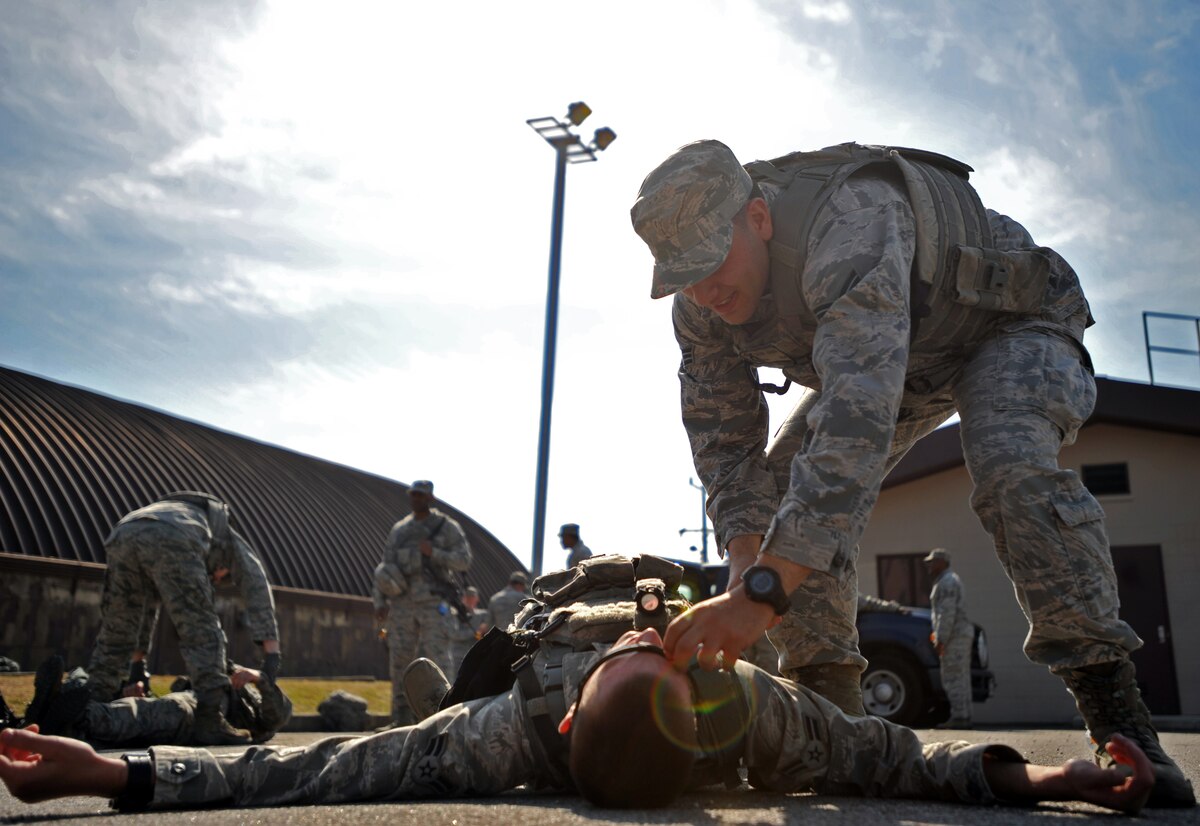 Staff Sgt. Darryl Thompson, 51st Security Forces Squadron fire team leader, conducts a body check during a field training exercise at Osan Air Base, Republic of Korea, Oct. 17, 2013. Before facing off with opposition forces role players, the fire teams took refresher training on self-aid and buddy care, dead body searches and intelligence gathering. (U.S. Air Force photo/Senior Airman Siuta B. Ika)