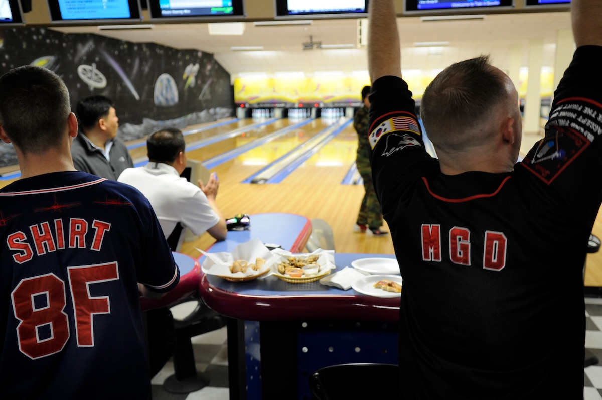 Chief Master Sgt. Ki Yeol Kim, left, Republic of Korea Air Force 38th Fighter Group command chief, puts on a Wolf Pack jersey presented to him by Chief Master Sgt. Scott Delveau, right, 8th Fighter Wing command chief April 2, 2012 at the Take it North Bowling Center on Kunsan Air Base, Republic of Korea. The two command chiefs bowled with other senior enlisted members from Kunsan AB, during a ROKAF/U. S. Air Force Enlisted Friendship event, which helps enlisted members build friendships with host country allies. (Courtesy photo)