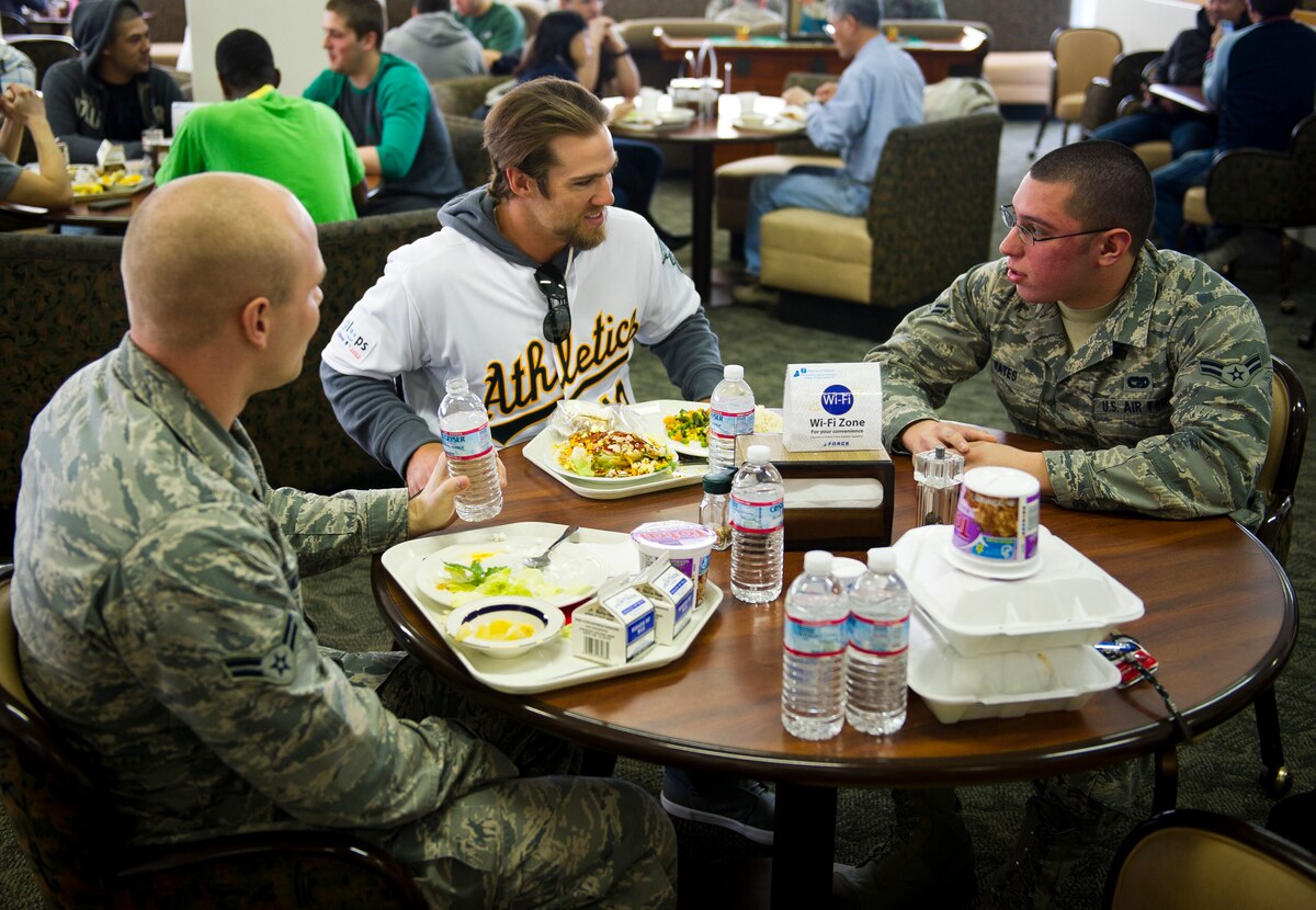 Collin Cowgill, Jonny Gomes and Josh Reddick, Oakland Athletics outfielders, throw balls for children to catch at Yokota Air Base, Japan, March 25, 2012. Eight players from the Athletics came to Yokota to meet with kids, eat lunch with Airmen and sign autographs. (U.S. Air Force photo/Staff Sgt. Chad C. Strohmeyer)
