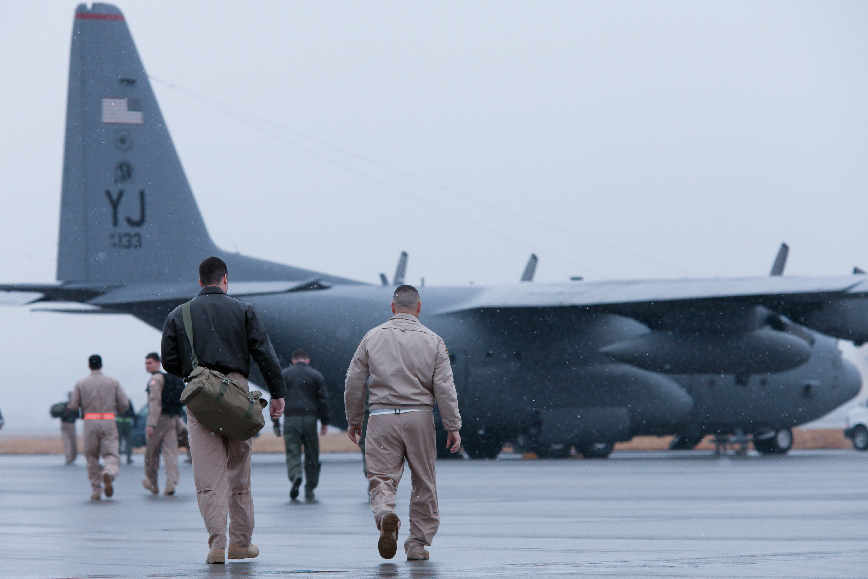 Lt. Col. Timothy Rapp (right), 36th Airlift Squadron commander, along with members from the 374th Airlift Wing, prepare to salute personnel from the 36th AS, 374th Operations Support Squadron, and 374th Logistics Readiness Squadron as they depart for a deployment to Southwest Asia Feb. 9, Yokota Air Base, Japan. (U.S. Air Force photo/Osakabe Yasuo)