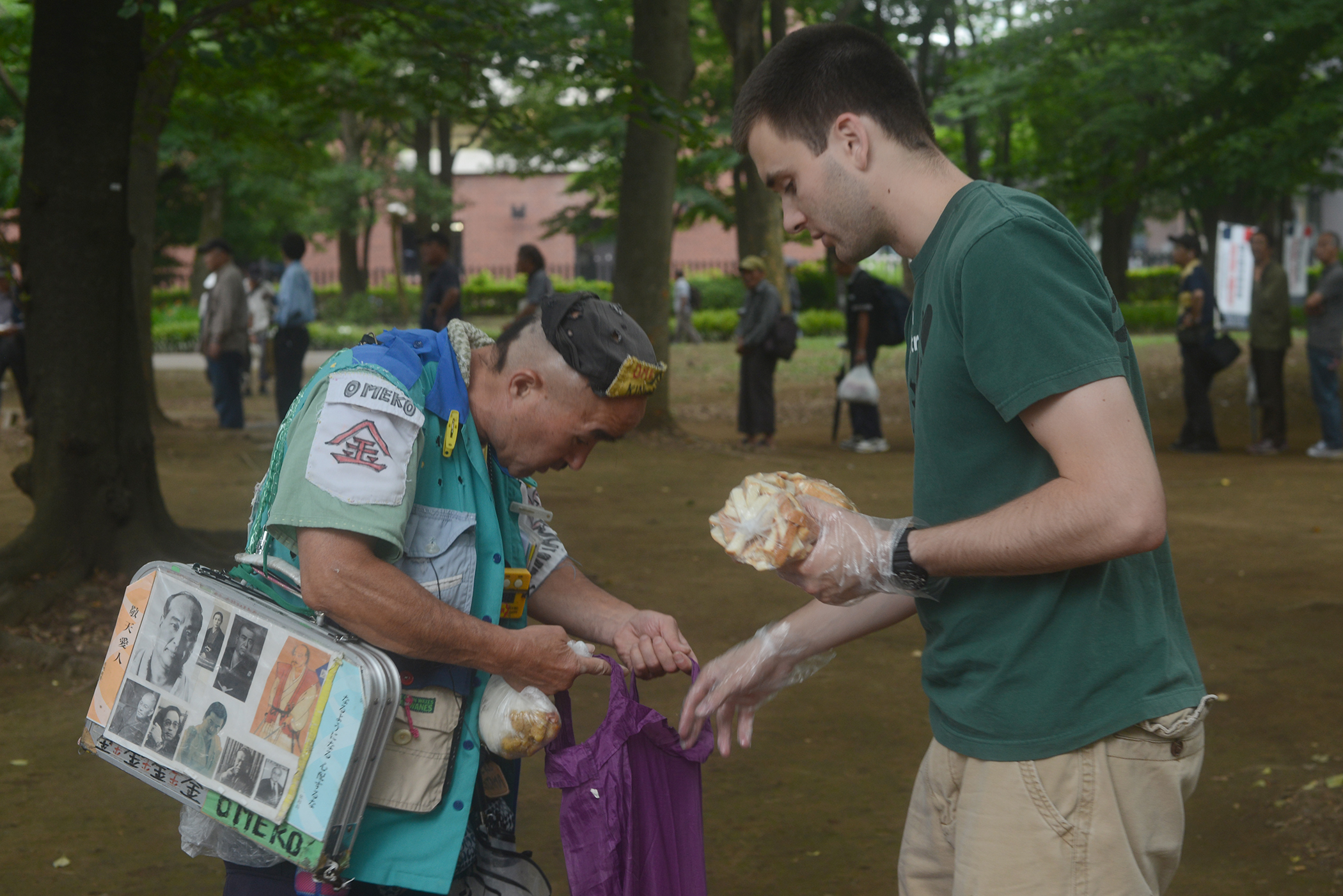 Members from Yokota Air Base, Japan, and members of a local church serve food to the homeless at Ueno Park, Tokyo Japan, June 26, 2015. The base chapel has received multiple commendations, including the Zenko-Kai award, for their participation in homeless outreach events. (U.S. Air Force photo by Airman 1st Class David C. Danford/Released)