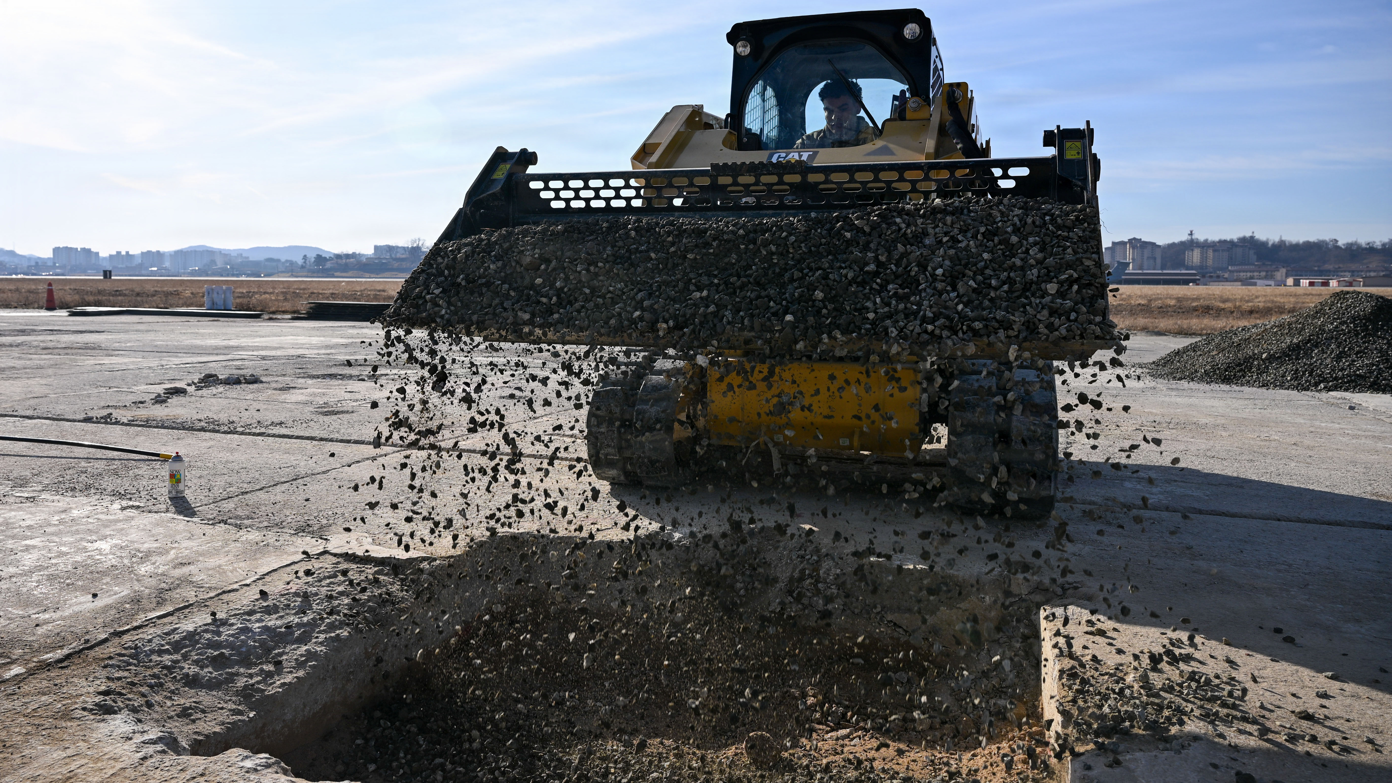 A U.S. Air Force Airman, assigned to the 51st Civil Engineer Squadron, dumps rocks into a crater during Rapid Osan Airfield Recovery training at Osan Air Base, Republic of Korea, Feb. 26, 2026. Airmen placed flowable fill concrete over compacted crushed stone as part of Osan’s ROAR concept, designed to rapidly generate aircraft launch capability. (U.S. Air Force photo by Senior Airman Rome Bowermaster)