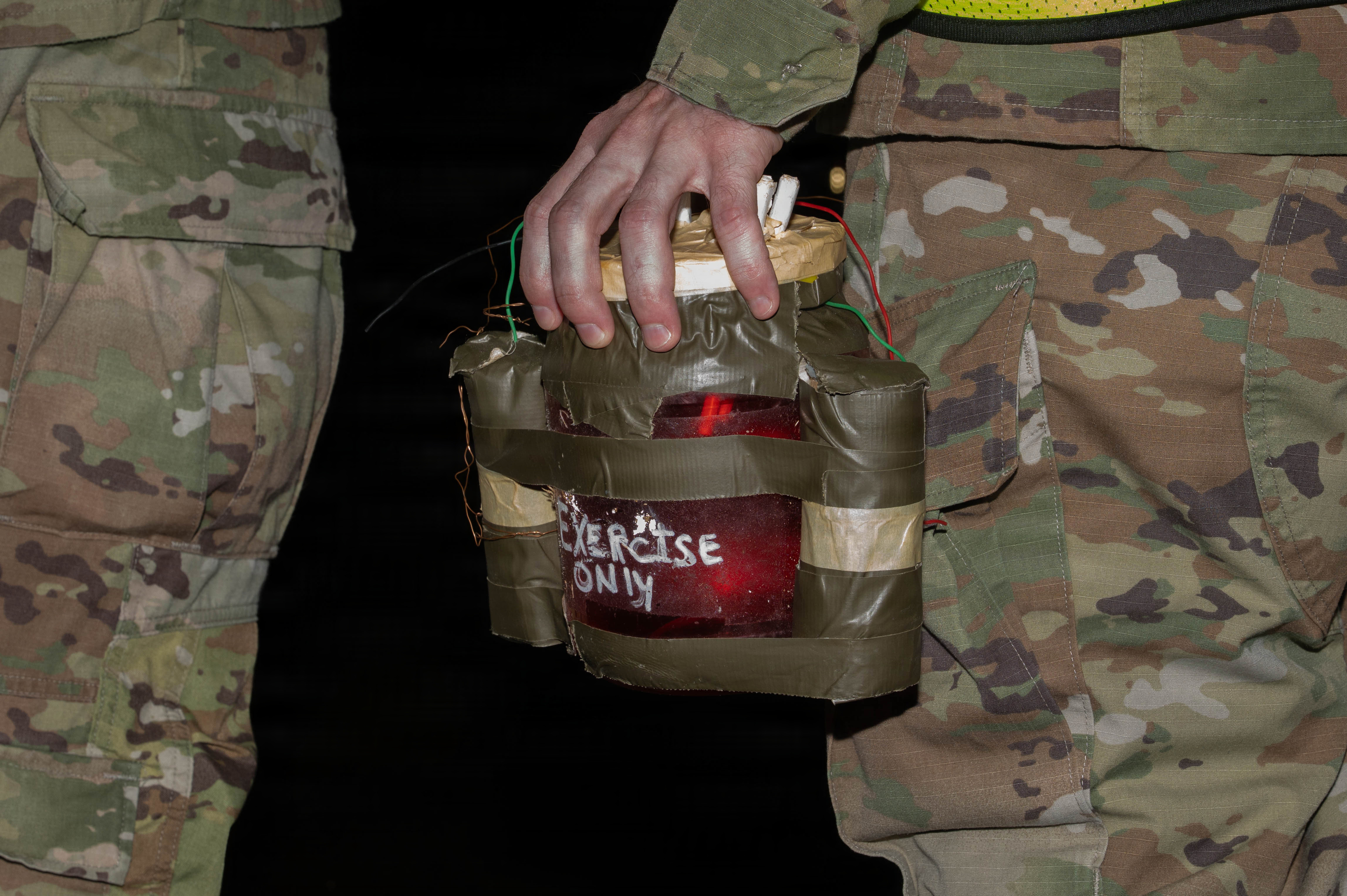 U.S. Air Force, Tech. Sgt. Brian Huntley, 733rd Air Mobility Squadron aerospace propulsions technician, and wing inspection team member, carries a simulated improvised explosive device during a USAF led operational exercise Beverly Midnight 26 at Kadena Air Base, Japan, March 12, 2026. BM26 provides an optimal environment to train for operations in contested environments, enhancing resiliency and readiness across all levels. (U.S. Air Force photo by Senior Airman Jamal Berry II)