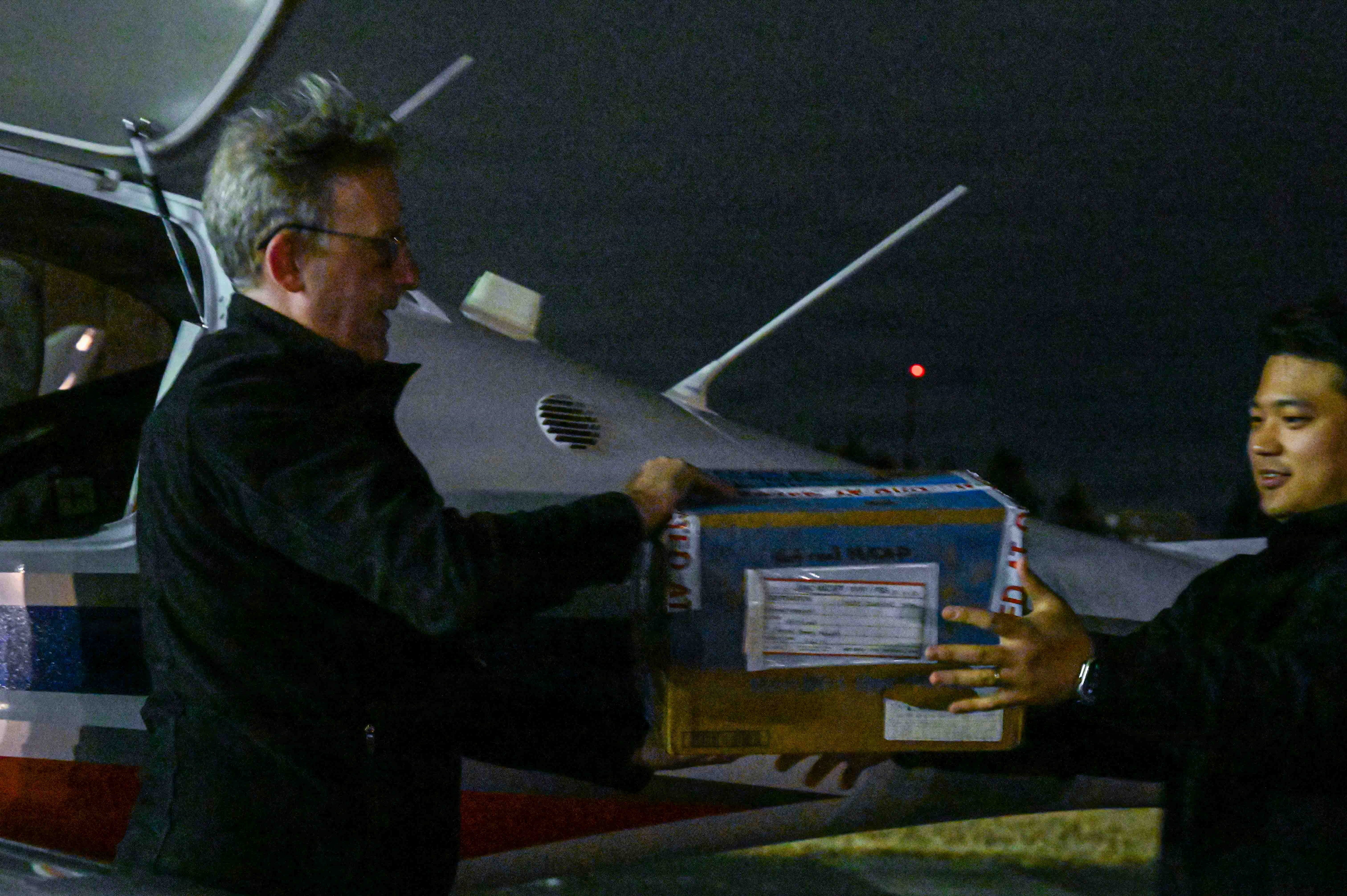 From the left, Jake Kadish, Yokota Flight Center chief instructor, hands simulated repair parts to Michael Shinji Kawashima, YFC assistant chief instructor, during a small parts delivery mission as part of exercise Beverly Midnight 2026 at Yokota Air Base, Japan, March 13, 2026. BM26 provides an optimal environment to enhance and understand possible opportunities to continue the advancement of shared interests. (U.S. Air Force photo by Staff Sgt. Manuel G. Zamora)