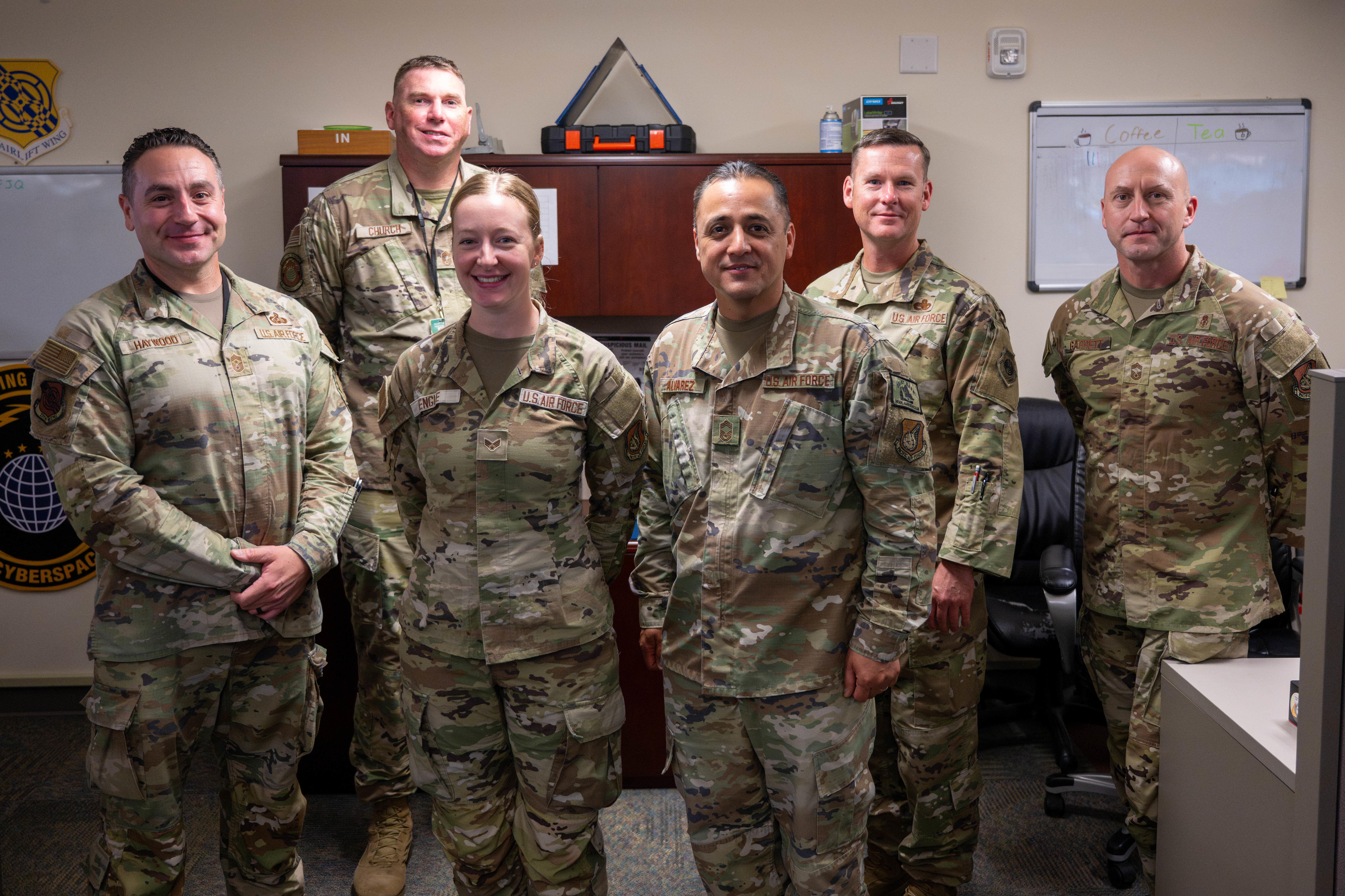 U.S. Air Force senior enlisted leaders pose for a group photo with Senior Airman Darian Engle after recognizing her as the 15th Wing’s Skywarrior of the Month on Joint Base Pearl Harbor-Hickam, Hawaii, August 12, 2025. Engle secured the F-22 mission in INDOPACOM by encrypting 39 aircraft, enabling 577 sorties and 840 flight hours in strategic missions. (U.S. Air Force photo by Airman 1st Class Aden Brown)