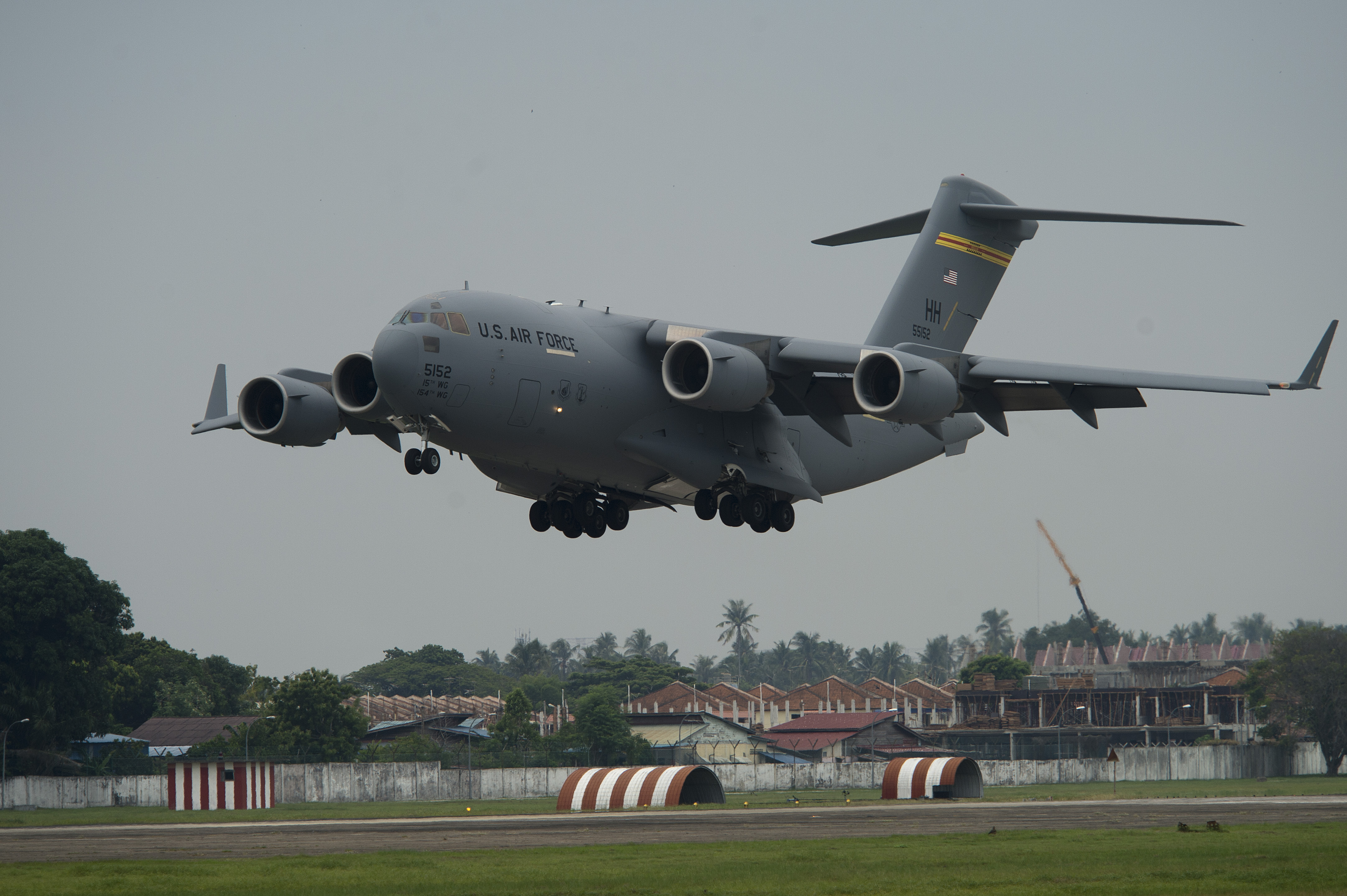 A U.S. Air Force C-17 Globemaster III from the 154th Wing, Joint Base Pearl Harbor-Hickam, Hawaii, lands at Royal Malaysian air force P.U. Butterworth, Malaysia, June 15, 2014 during Cope Taufan 14. Cope Taufan is a biennial large force employment exercise taking place June 9 to 20 designed to improve U.S. and Malaysian combined readiness. (U.S. Air Force photo by Tech. Sgt. Jason Robertson/Released)