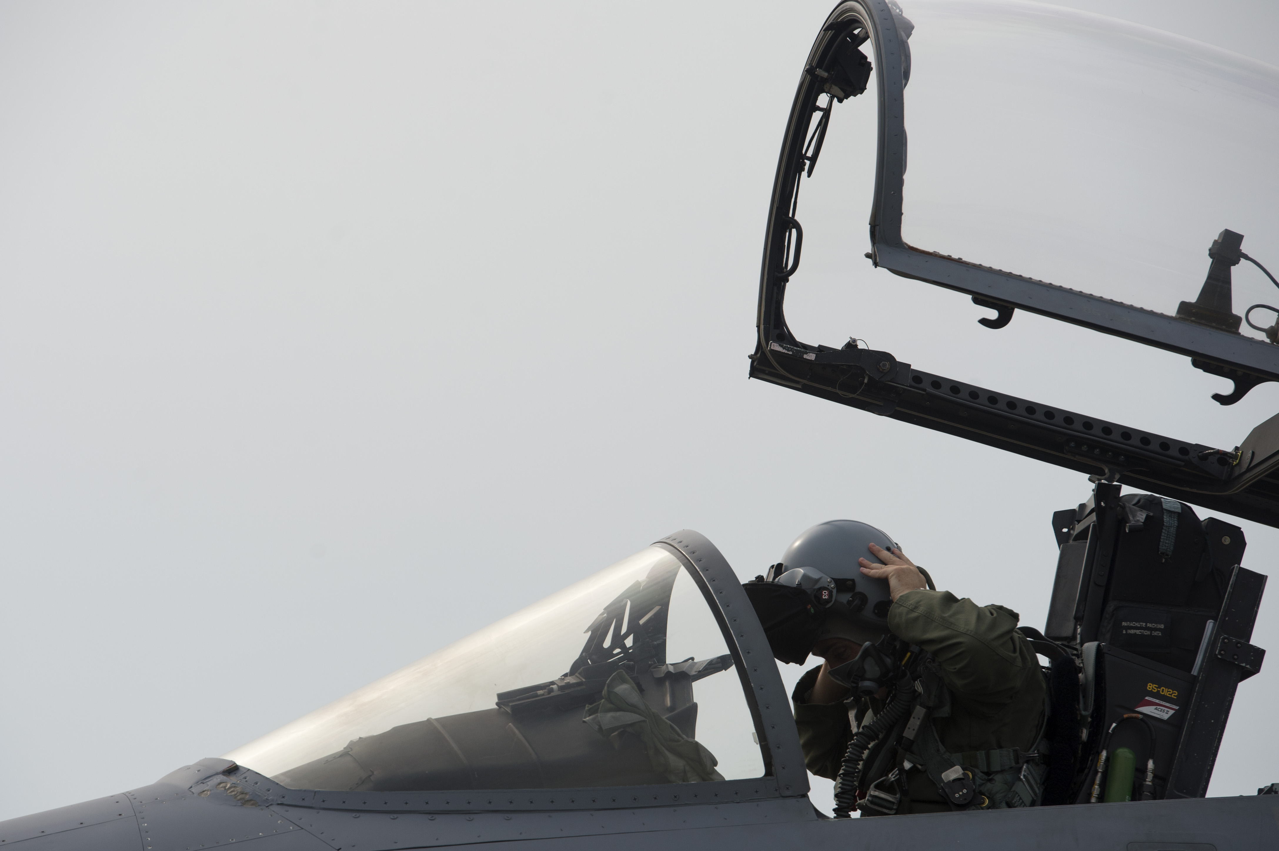 U.S. Air Force, Lt. Col. Jared Conaboy, an F-15 Eagle pilot from the 131st Fighter Squadron, 104th Fighter Wing, Barnes Air National Guard Base, Massachusetts, prepares to take off on an exercise sortie in support of Cope Taufan 14, at Royal Malaysian air force P.U. Butterworth, Malaysia, June 17, 2014. Cope Taufan is a biennial large force employment exercise taking place June 9 to 20 designed to improve U.S. and Malaysian combined readiness. (U.S. Air Force photo by Tech. Sgt. Jason Robertson/Released)