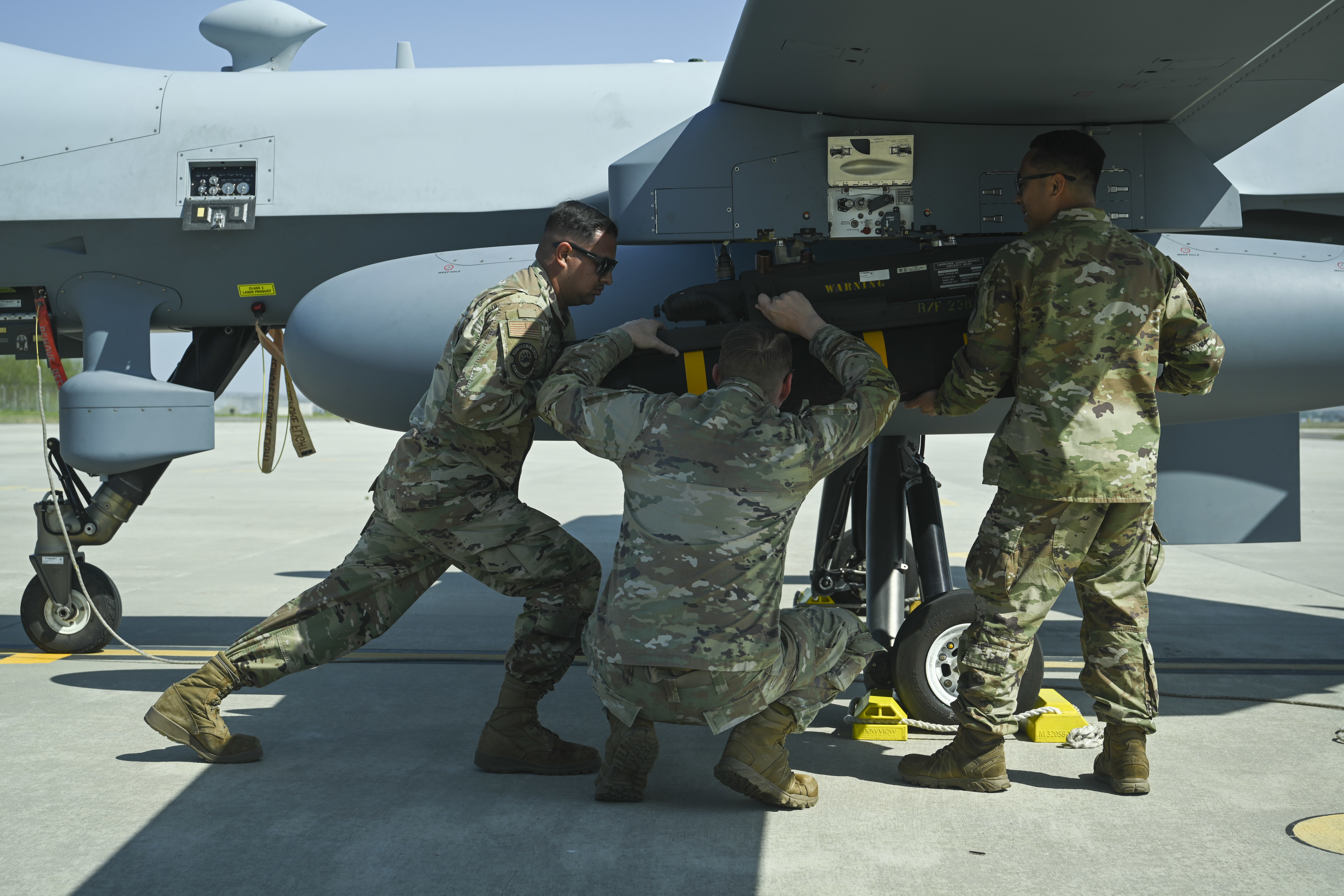 Senior Airman Eduardo Ledezma, left, Tech. Sgt. Kristopher Speir, center, and Tech Sgt. Aldrich Aldana, 163d Attack Wing MQ-9 Reaper armament systems specialists, load an AGM-114 Hellfire missile onto an MQ-9 Reaper at Kunsan Air Base, Republic of Korea, April 30, 2025. By sustaining a combat-credible force, Kunsan enhances the Indo-Pacific’s integrated defense posture and enables rapid, flexible response to emerging threats. (U.S. Air Force photo by Staff Sgt. Daniel Brosam)