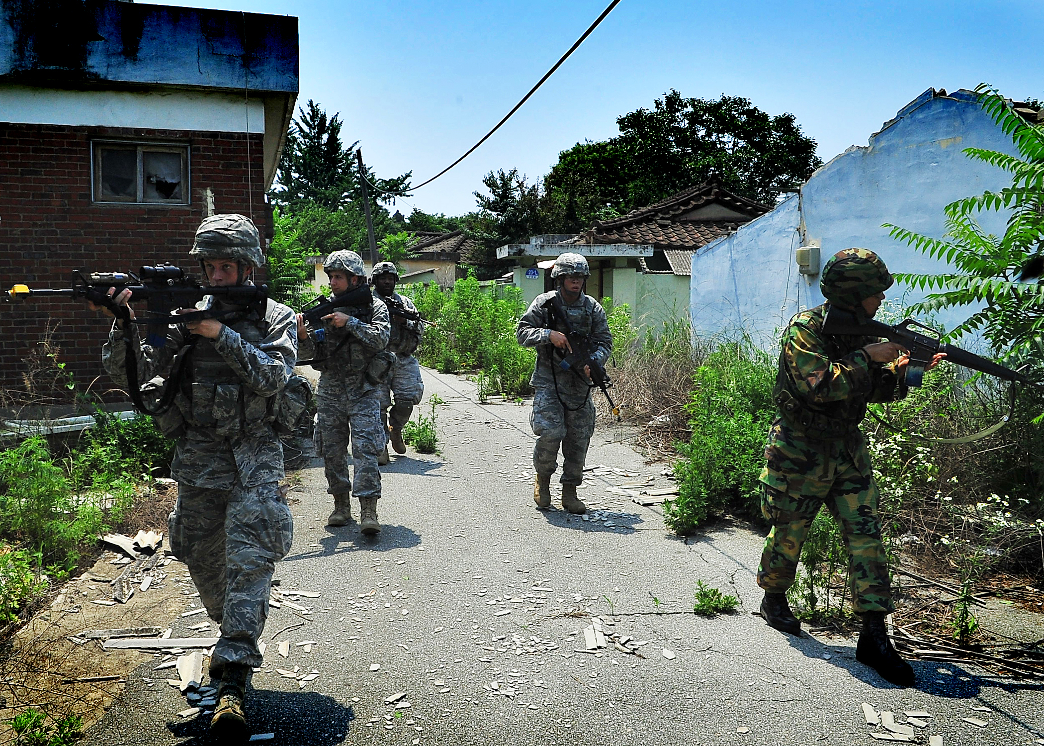 51st Security Forces Squadron and Republic of Korea Air Force members performed base defense operations training during the combat readiness course at Osan Air Base, June 26. During training, combined SF members' reacted to [simulated] hostile forces. Members were challenged with securing Base Alpha, executing troop movement maneuvers and communication tactics. Security Forces members are responsible for ensuring the safety of bases, weapons, property and personnel from hostile forces. (U.S Air Force Photo by/Staff Sgt. Daylena Gonzalez)