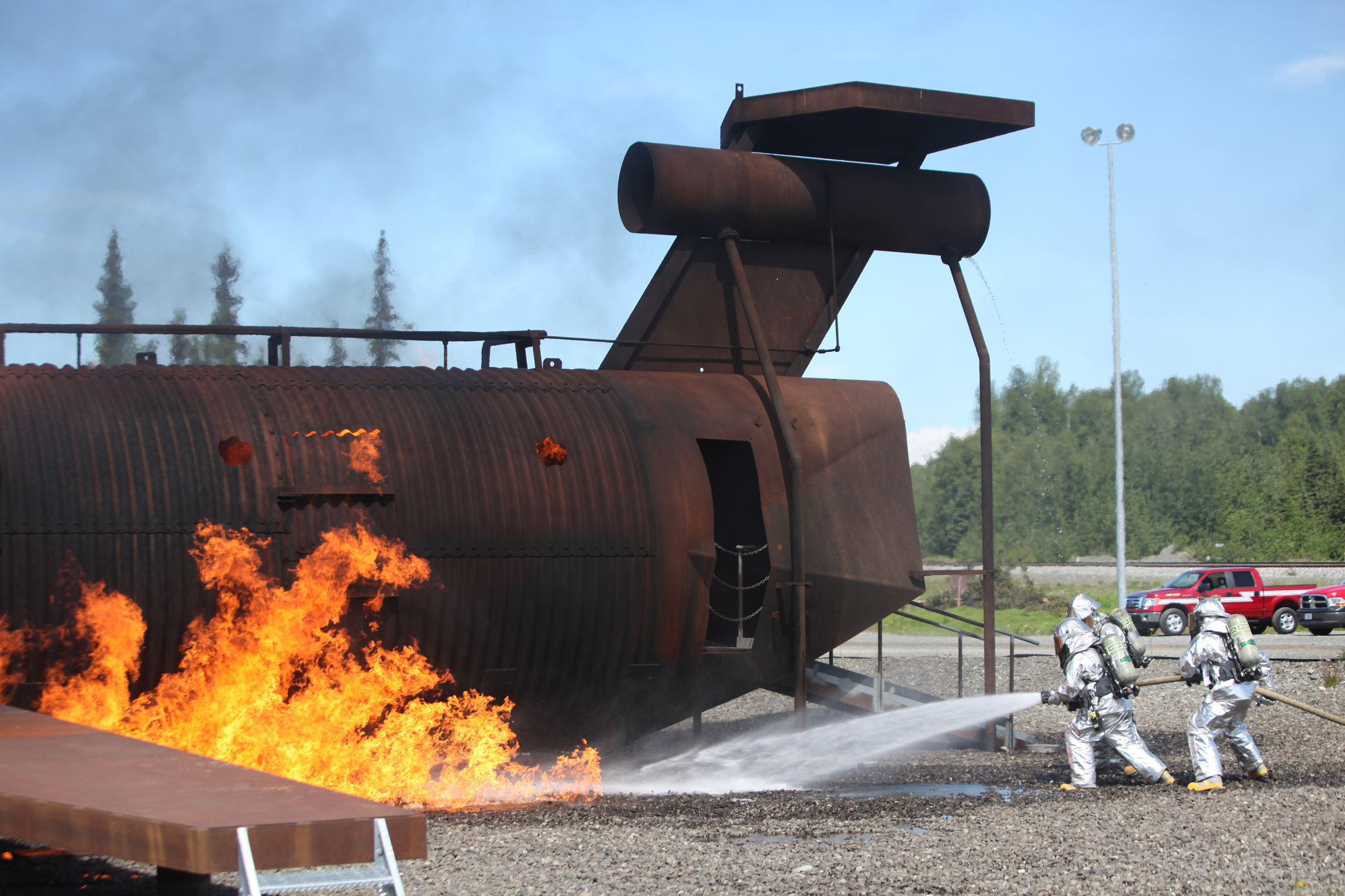 JOINT BASE ELMENDORF-RICHARDSON, Alaska -- Firefighters from the 673rd Civil Engineer Squadron at Joint Base Elmendorf-Richardson complete rescue training June 17, 2011. In addition to maintaining the same training qualifications as civilian firefighters, the Airmen must learn how to rescue aviators from the various aircraft participating in Exercise Northern Edge 11. More than 6,000 servicemembers and 150 aircraft are participating in Alaska's largest military training exercise. (Photo by Marine Cpl. Marionne T. Mangrum)