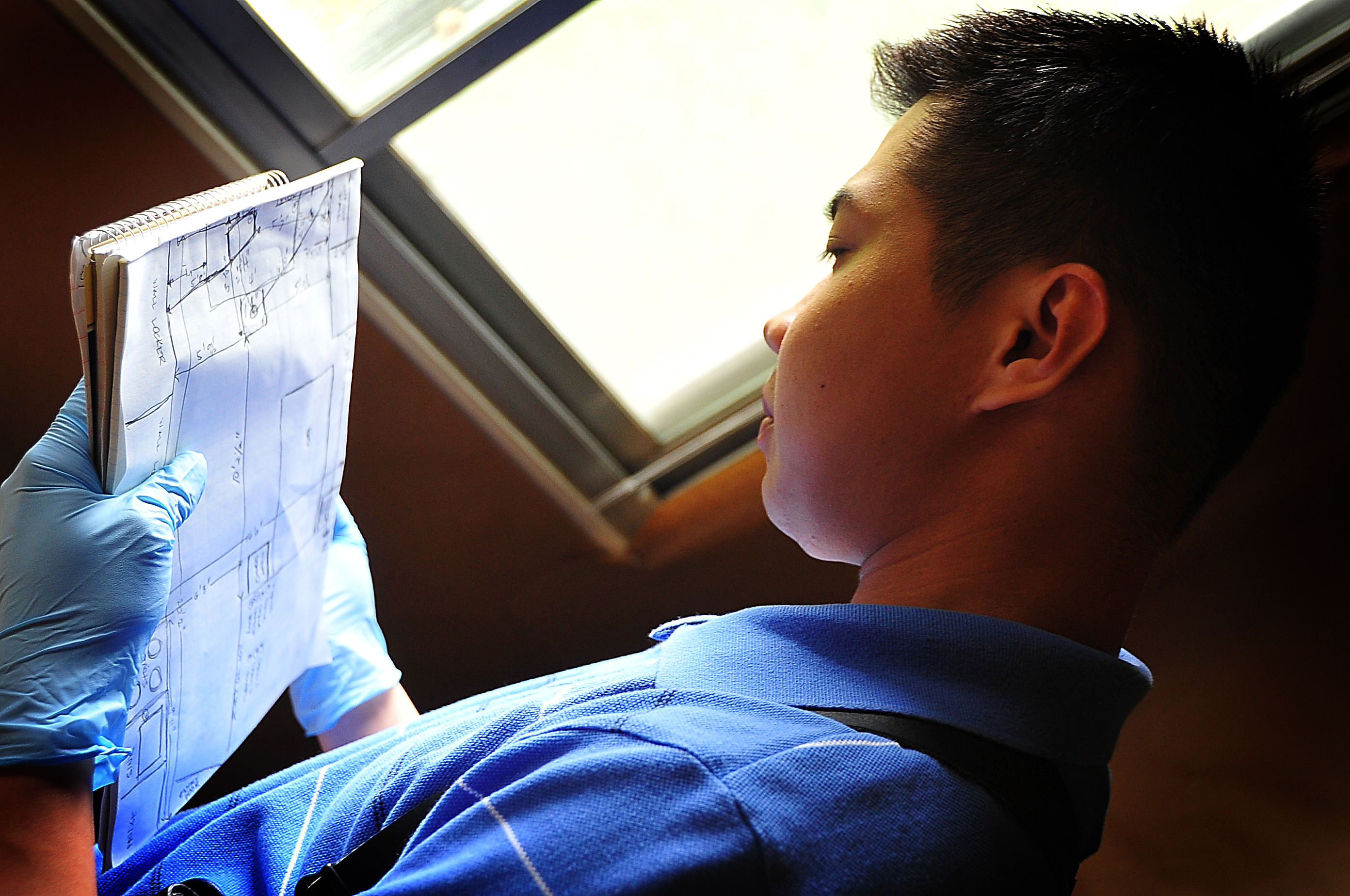 The Air Force Office of Special Investigations held an annual Crime Scene Investigation/ Active shooter exercise, here, April 27. The scene was prepared with sheep’s blood and a moulaged dummy victim. A husband returning from deployment, has Post Traumatic Stress Disease, kills his wife and abducts his child fleeing the dead wife scene. The neighbor hears the shots and phones 911. At the simulated residence, Bldg 930, Security Forces cleared the residence and OSI processed the scene gathering evidence. The suspect killed his child and an active shooter incident took place. This exercise helped field agents sharpen their CSI skills. (U.S. Air Force Photo by Staff Sgt. Daylena Gonzalez)
