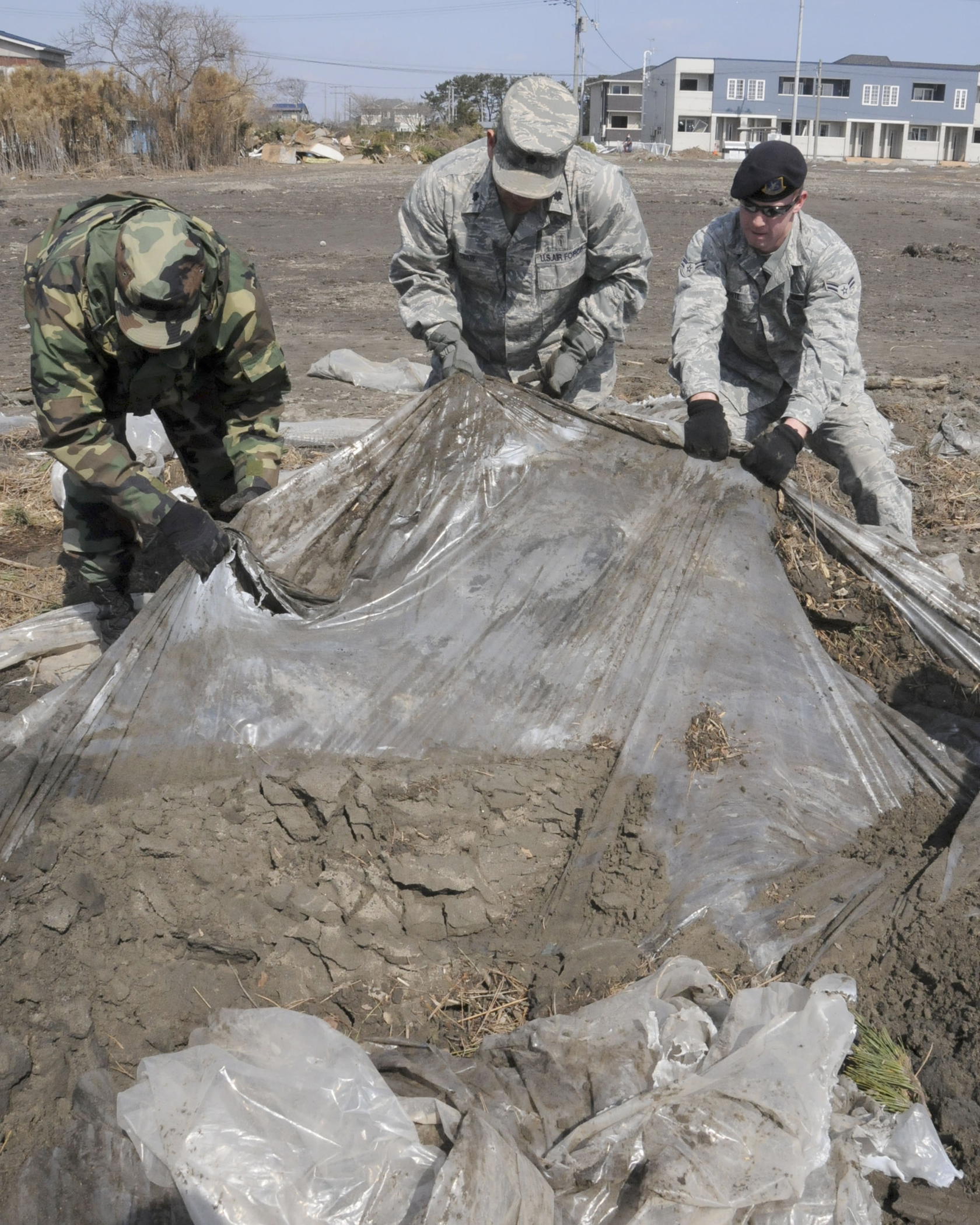 Airmen uncover plastic sheets April 1, 2011, at a strawberry farm in Hachinohe, Japan. (U.S. Air Force photo/Staff Sgt. Rachel Martinez)