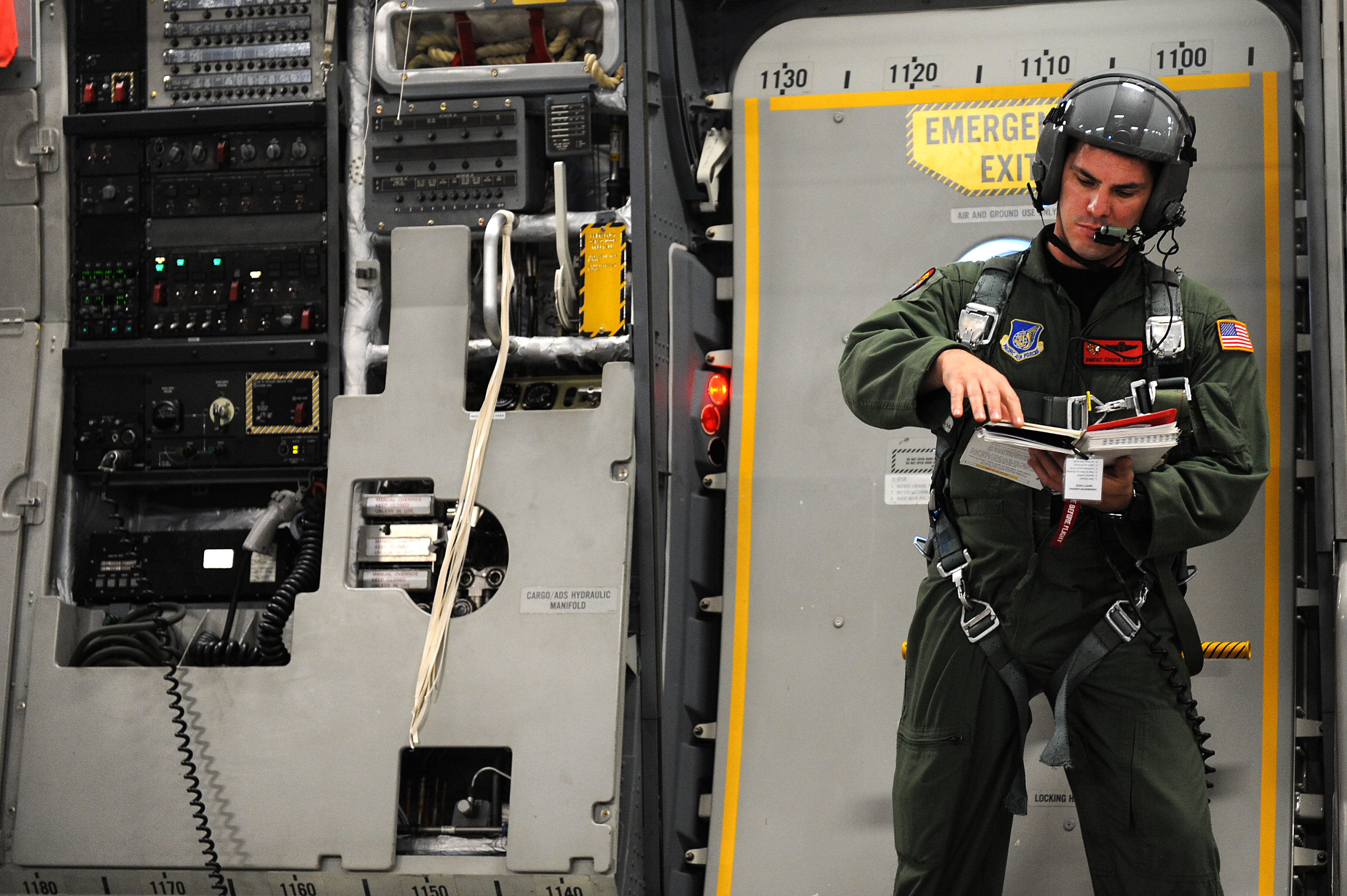 Senior Master Sgt. Chuck Baker, 535th Airlift Squadron, goes over airdrop checklist during flight operations on a C-17 Globemaster III perparing for a follow-on airdrop training operations over Andersen Air Base, Guam. Aircrews from the 535th AS dropped nine training pallets during a single day of training. The aircrew then helped the 36th Contingency Response Group with static line jump training. (U.S. Air Force photo/Staff Sgt. Mike Meares)