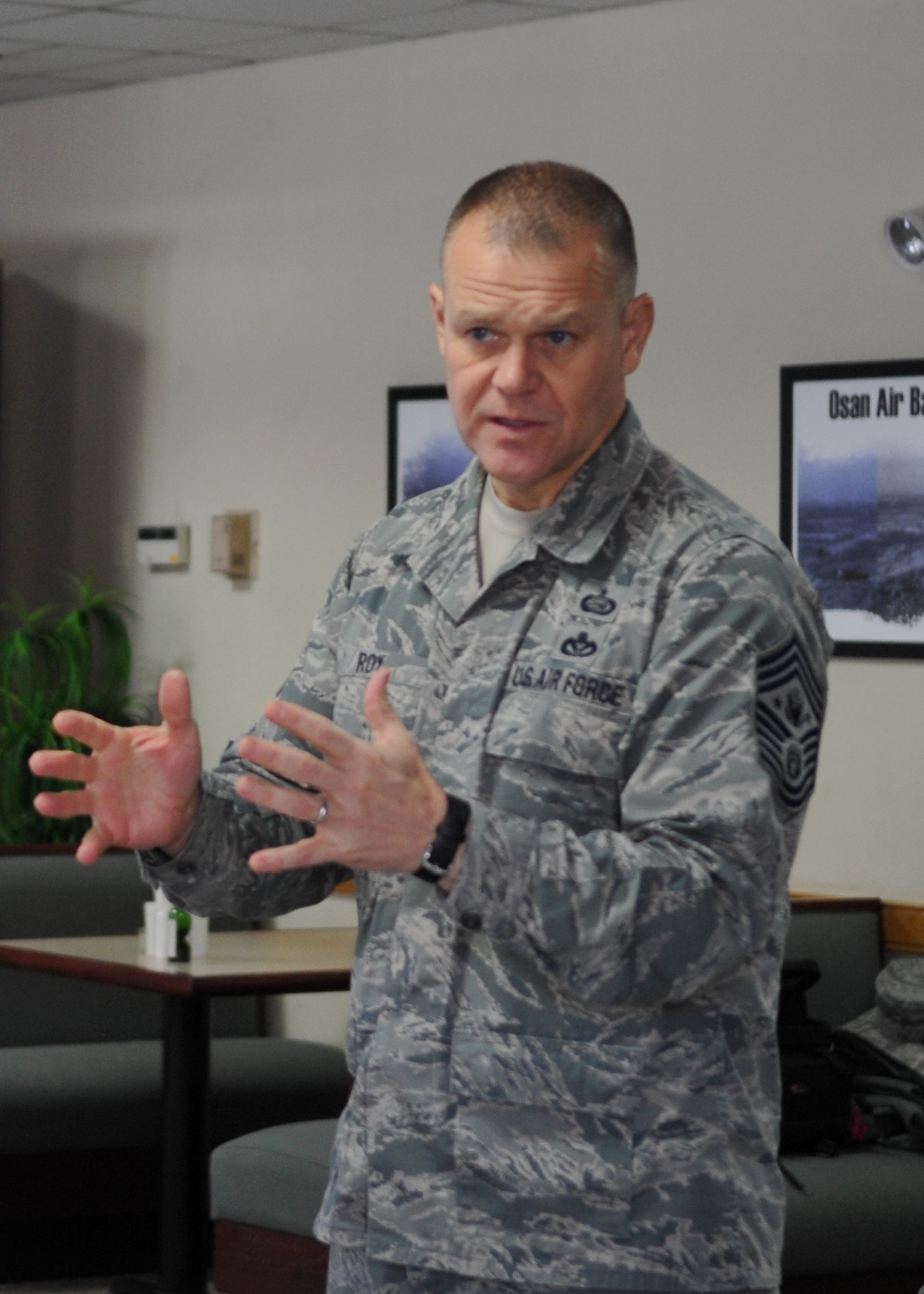 Chief Master Sgt. of the Air Force James Roy addresses 51st Fighter Wing Airmen, Dec. 31, 2010, at Osan Air Base, Republic of Korea. Chief Roy discussed issues regarding enlisted perspective and key issues across the Air Force. (U.S. Air Force photo/Senior Airman Evelyn Chavez)