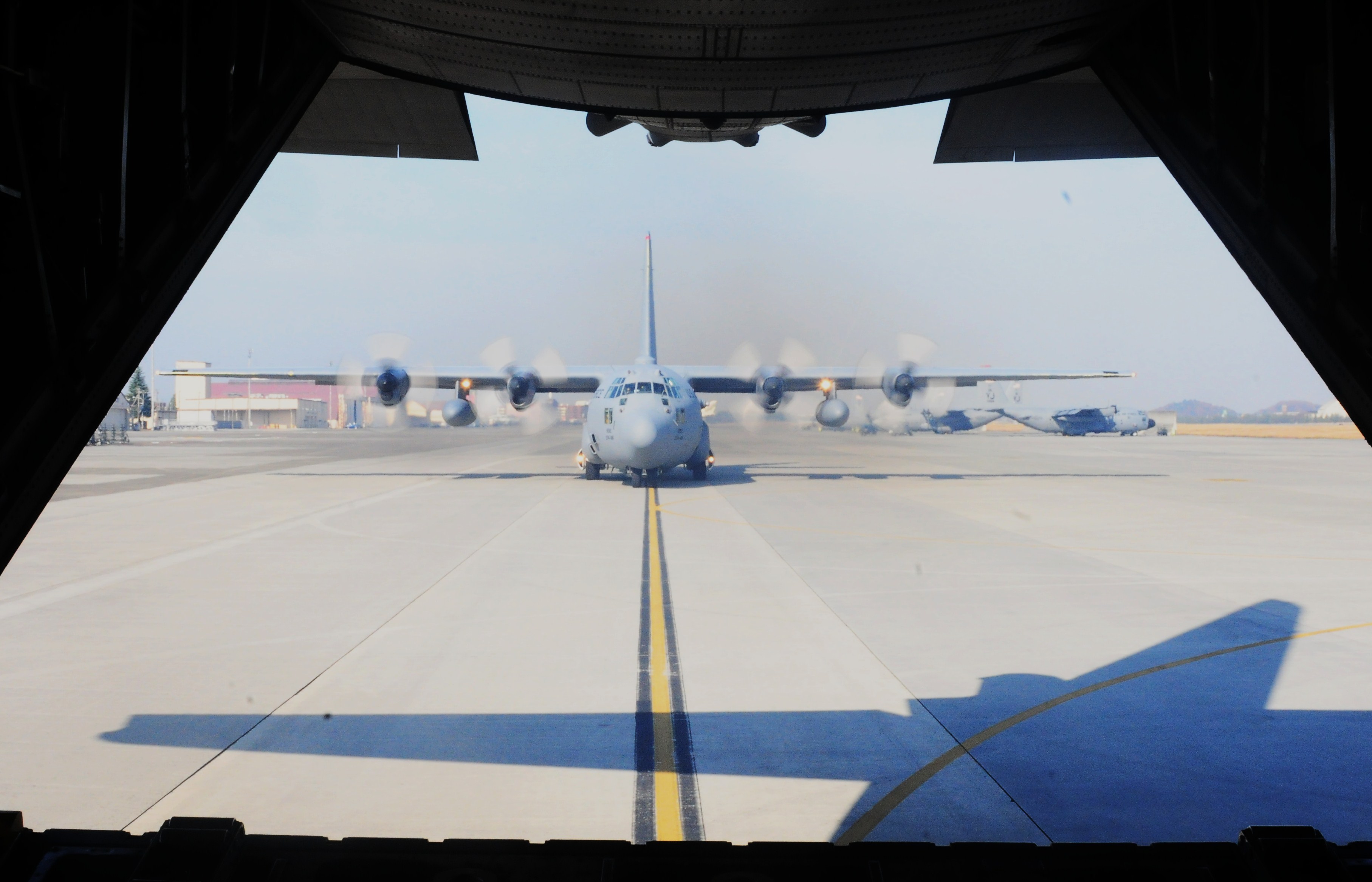 A 374th Airlift Wing C-130 taxis to its parking spot on the Yokota Air Base flightline Dec. 6. The wing flew more than one dozen members of the international media as part of their orientation to exercise Keen Sword, which takes place Dec. 3-10 at locations throughout Japan. (U.S. Air Force photo/1st Lt. Bryan Bouchard)