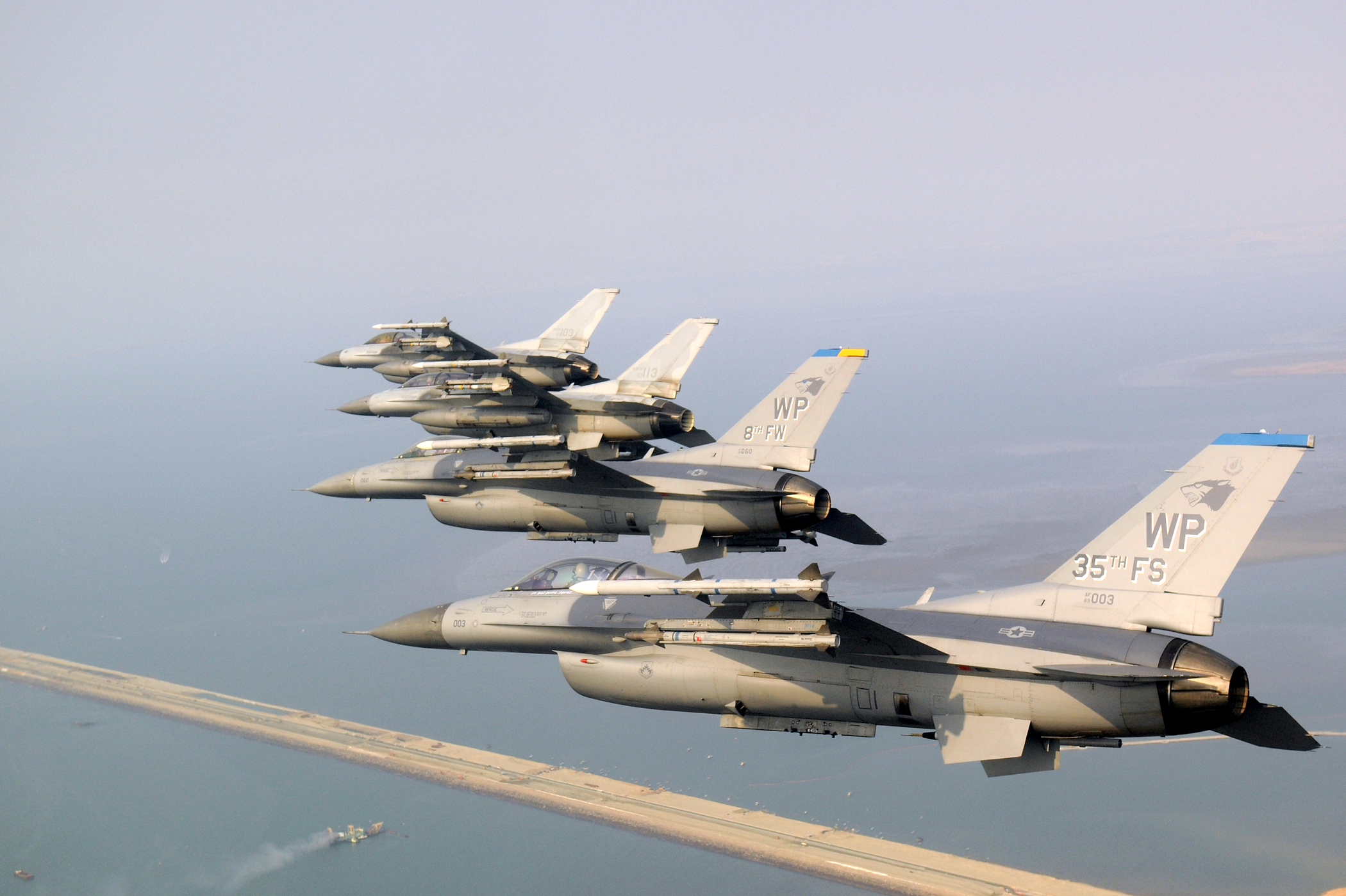 Four F-16 Fighting Falcons fly during a U.S. and South Korean air force coalition flight Nov. 10, 2010, over the Saemangeum Seawall during a U.S. and South Korean air force coalition flight in celebration of the 60th anniversary of the Korean War. (U.S. Air Force photo/Master Sgt. Jason Wilkerson)