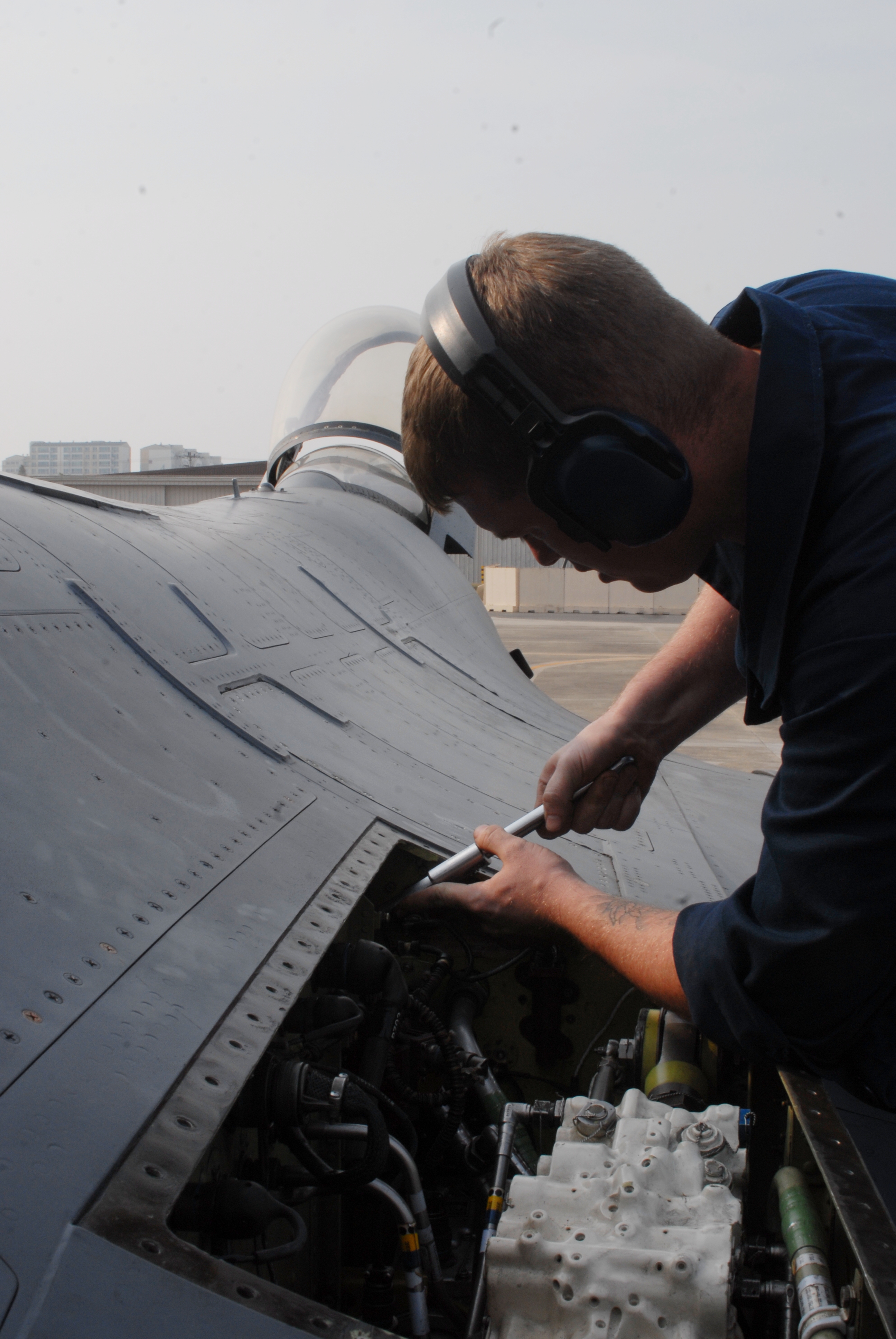 Staff Sgt. John Newhouse, 51st Aircraft Maintenance Squadron, performs flight control maintenance on an Osan F-16 Fighting Falcon Oct. 20 during exercise Max Thunder 10-2 at Kwangju Air Base, Republic of Korea. (U.S. Air Force photo/Staff Sgt. Eric Burks)