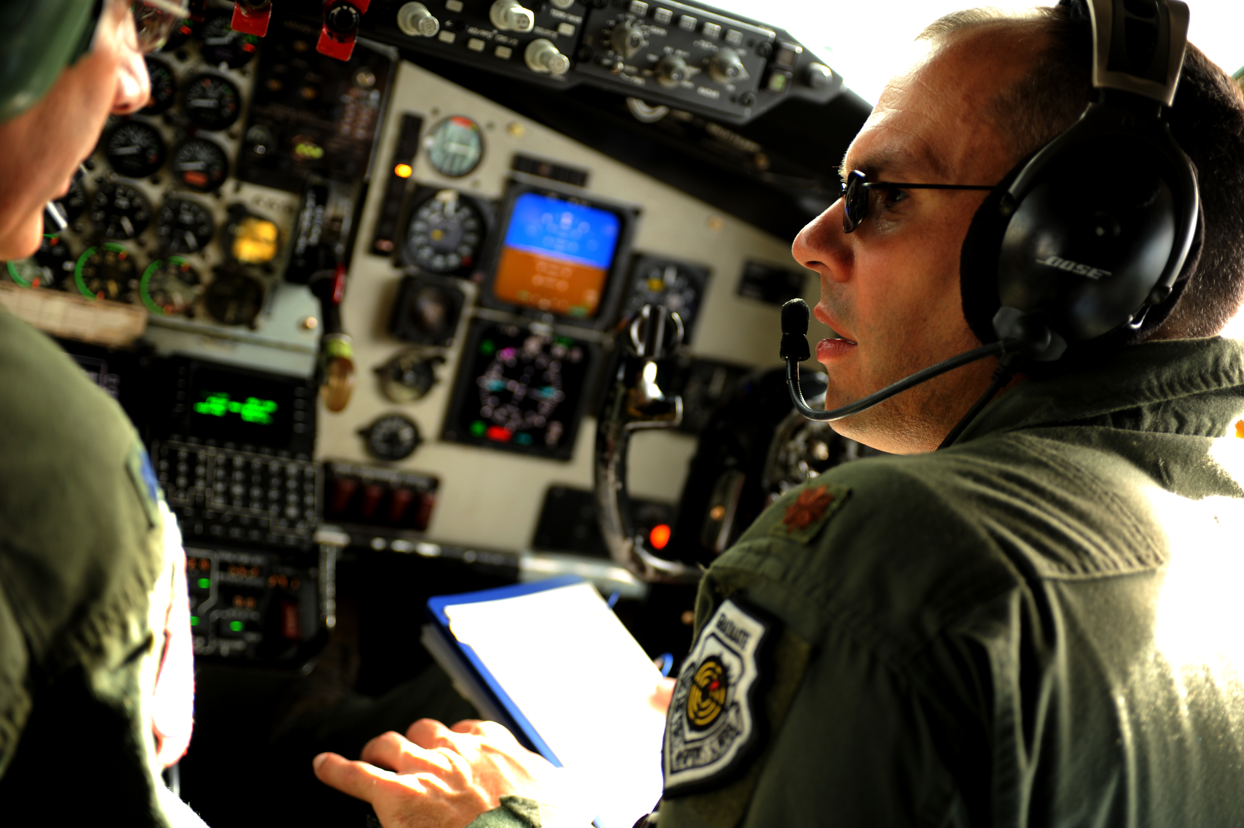 OVER THE PACIFIC -- Maj. Jeff Paget, 96th Air refueling Squadron director of operations, runs the pre-flight checklist with Lt. Col. Gene Feller, 203rd Air Refueling Squadron pilot, prior to a refueling mission Sept. 18. They performed a refueling mission with a C-17 Globemaster III bound for Andersen Air Base, Guam. The C-17 assigned to the 15th Wing, Joint Base Pearl Harbor Hickam, is operated by the 15th Wing and the Hawaii National Guard?s 154th Wing. Through a Total Force Integration partnership, the Activity Duty and Guard units jointly operate the C-17, the KC-135 Stratotanker and the F-22 Raptor. (U.S. Air Force photo/Staff Sgt. Mike Meares)