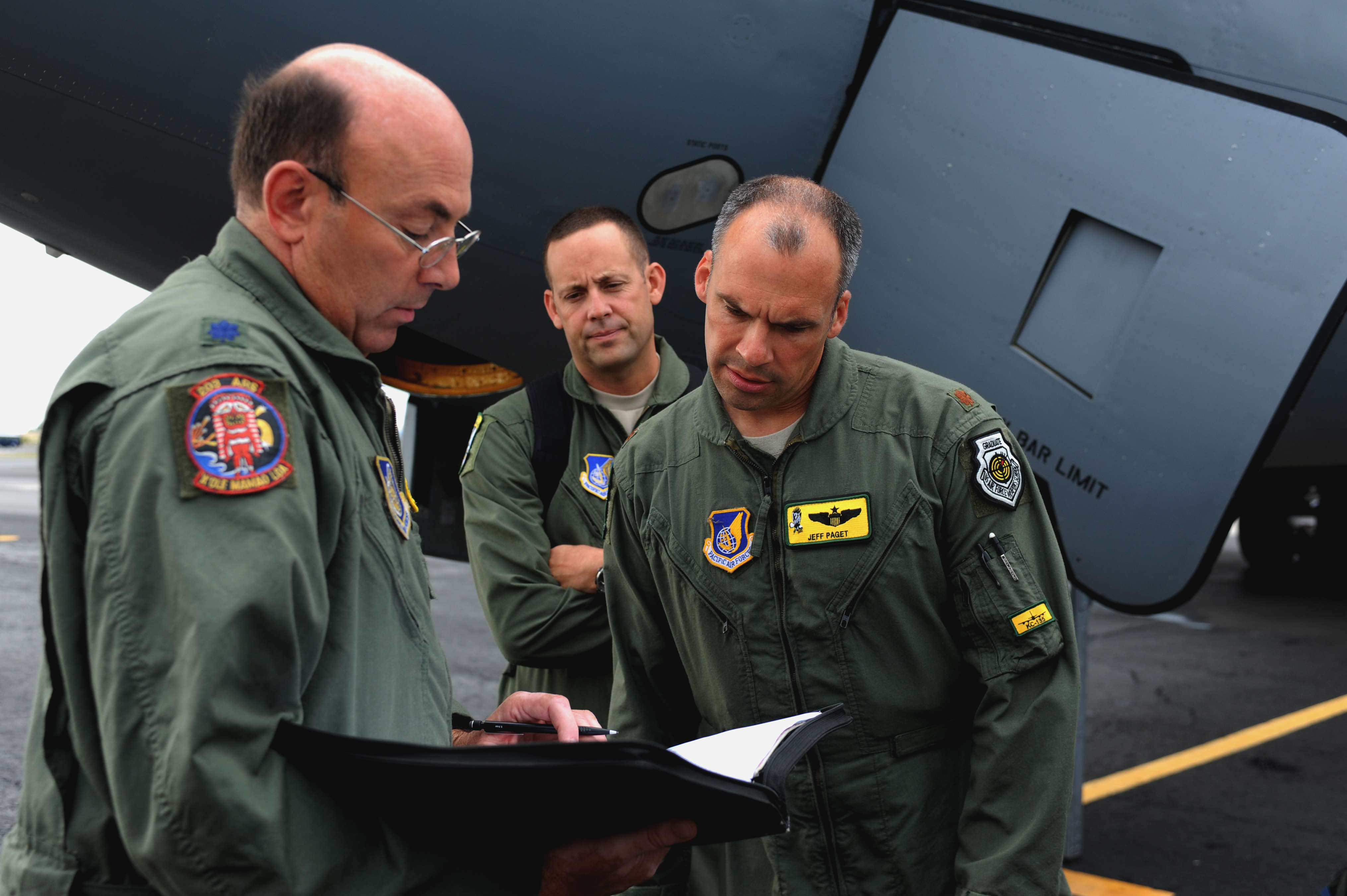 JOINT BASE PEARL HARBOR HICKAM, Hawaii -- Lt. Col. Gene Feller, 203rd Air Refueling Squadron, Maj. Jeff Paget and Senior Master Sgt. Dicky Hunt, 96th Air Refueling Squadron, go over the maintenance log during a re-flight inspection prior to a refueling mission Sept. 18. They performed a refueling mission with a C-17 Globemaster III bound for Andersen Air Base, Guam. The C-17 assigned to the 15th Wing, Joint Base Pearl Harbor Hickam, is operated by the 15th Wing and the Hawaii National Guard?s 154th Wing. Through a Total Force Integration partnership, the Activity Duty and Guard units jointly operate the C-17, the KC-135 Stratotanker and the F-22 Raptor. (U.S. Air Force photo/Staff Sgt. Mike Meares)