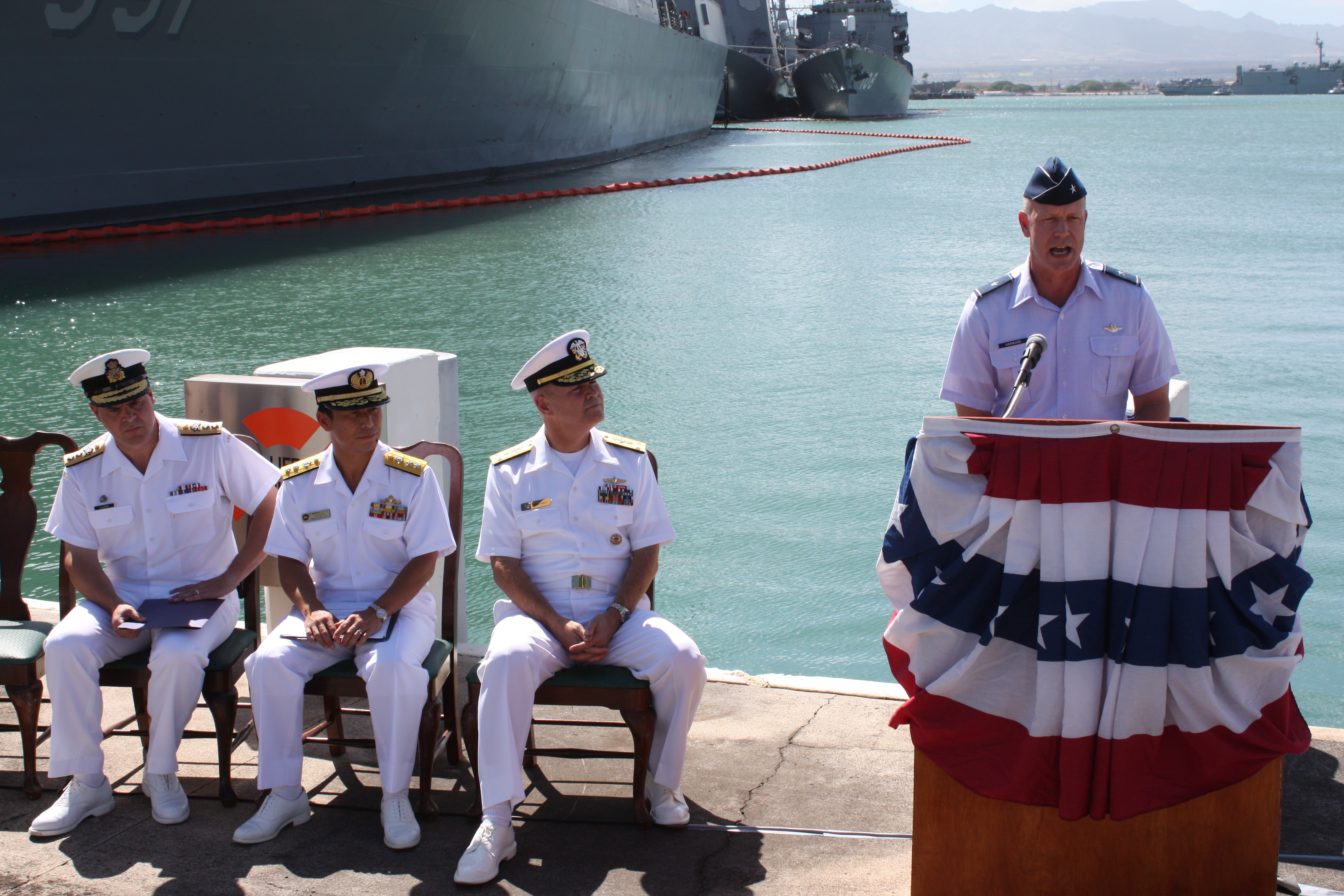 Brig. Gen. Thomas P. Harwood II, mobilization assistant to the commander, Thirteenth Air Force, and the combined forces air component commander for RIMPAC 2010, speaks to the media during the closing press conference for RIMPAC 2010 at Joint Base Pearl Harbor Hickam, Hawaii, on June 23, 2010. The Rim of the Pacific Exercise is the world's largest international maritime exercise that prepares forces to be interoperable and ready for a wide range of potential operations. The 613th Air and Space Operations Center at JBPH served as the central hub for data and voice communications during the biennial exercise which was held in the Hawaii operating area from June 23 through July 30. (U.S. Air Force photo/ Master Sgt. Victoria Meyer)