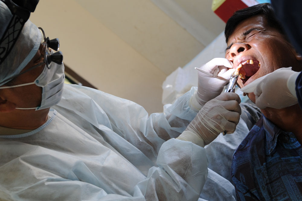 A local Thai man has a tooth extracted by Maj. (Dr.) Kurt Nishiguchi at the Ban Nong Sroung School in Thailand on March 4. Major Nishiguchi is an Air Force reservist deployed to Cope Tiger 2010 from Joint Base Pearl Harbor Hickam, Hawaii. Airmen from the U.S., Royal Thai and Republic of Singapore air forces are providing medical, dental and optometry care to local residents as part of the multilateral exercise. (U.S. Air Force photo/Tech Sgt. Cohen A. Young)