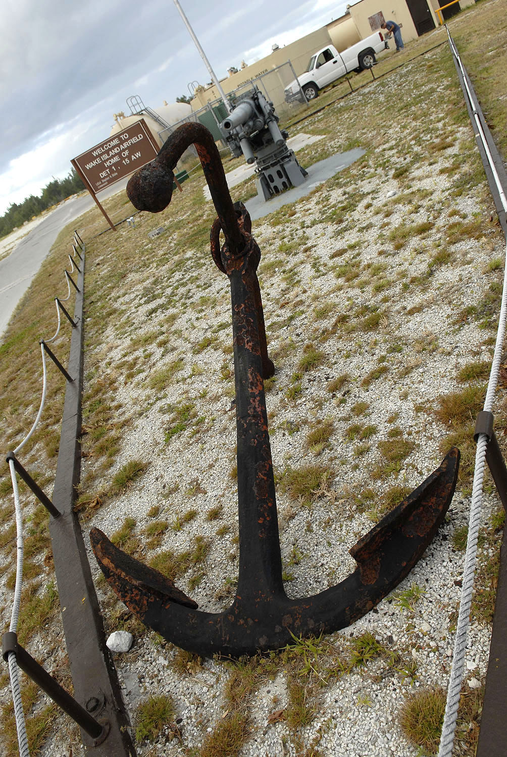 WAKE ISLAND -- An old rusty naval anchor, an artillery gun, and the welcome to Wake Island sign, on Wake Island, Jan 27, 2010. (U.S. Air Force photo/Tech. Sgt. Jerome S. Tayborn)