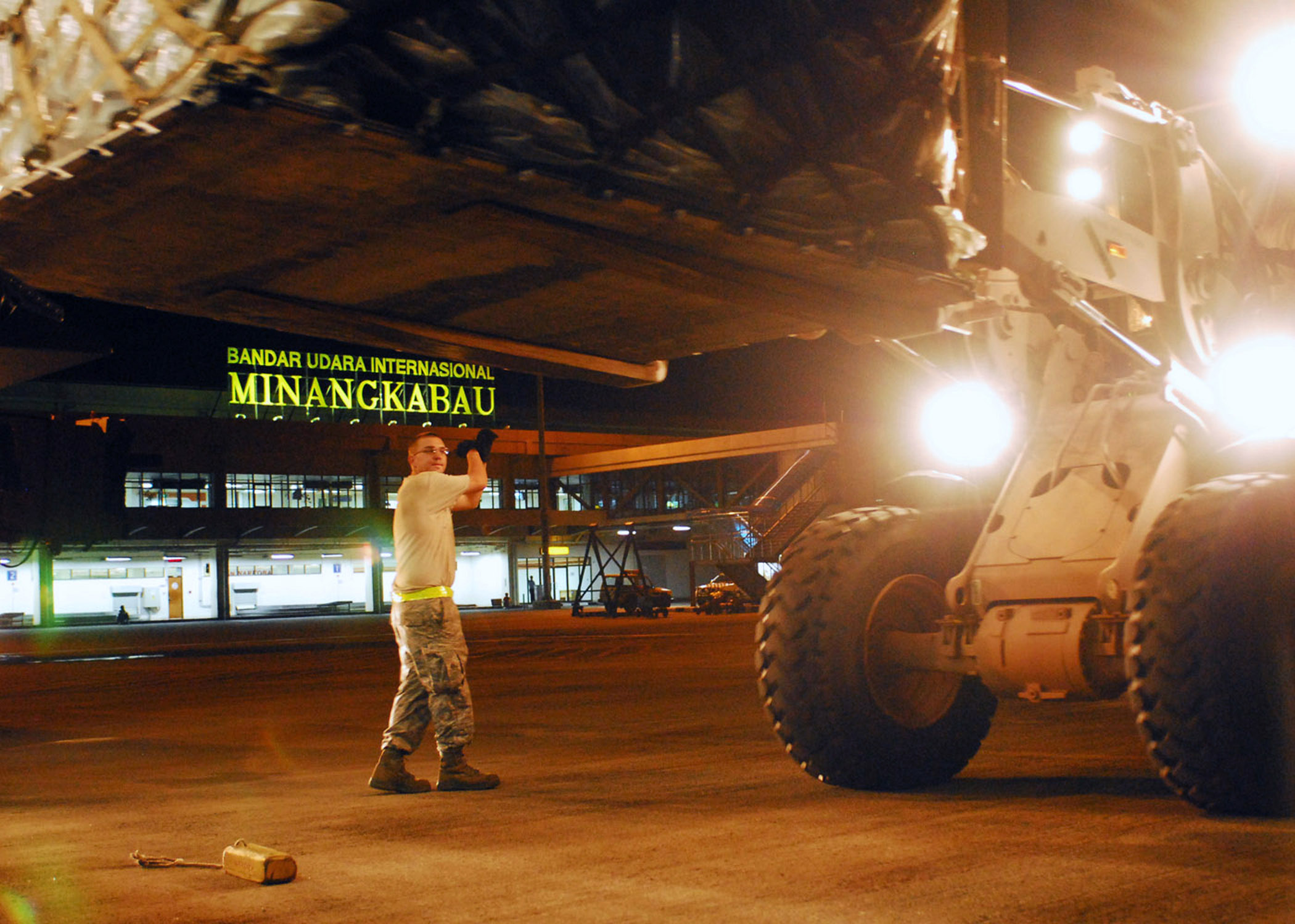 PADANG, Indonesia -- Staff Sgt. Christopher West, 36th Mobility Response Squadron from Andersen Air Force Base, Guam, marshals a forklift carrying medical supplies off of a C-17 Globemaster III Oct. 5. Sergeant West is an air transportation specialist deployed here with the Humanitarian Assistance Rapid Response Team to provide medical assistance for those affected by the recent earthquake. (U.S. Air Force photo/Staff Sgt. Veronica Pierce)