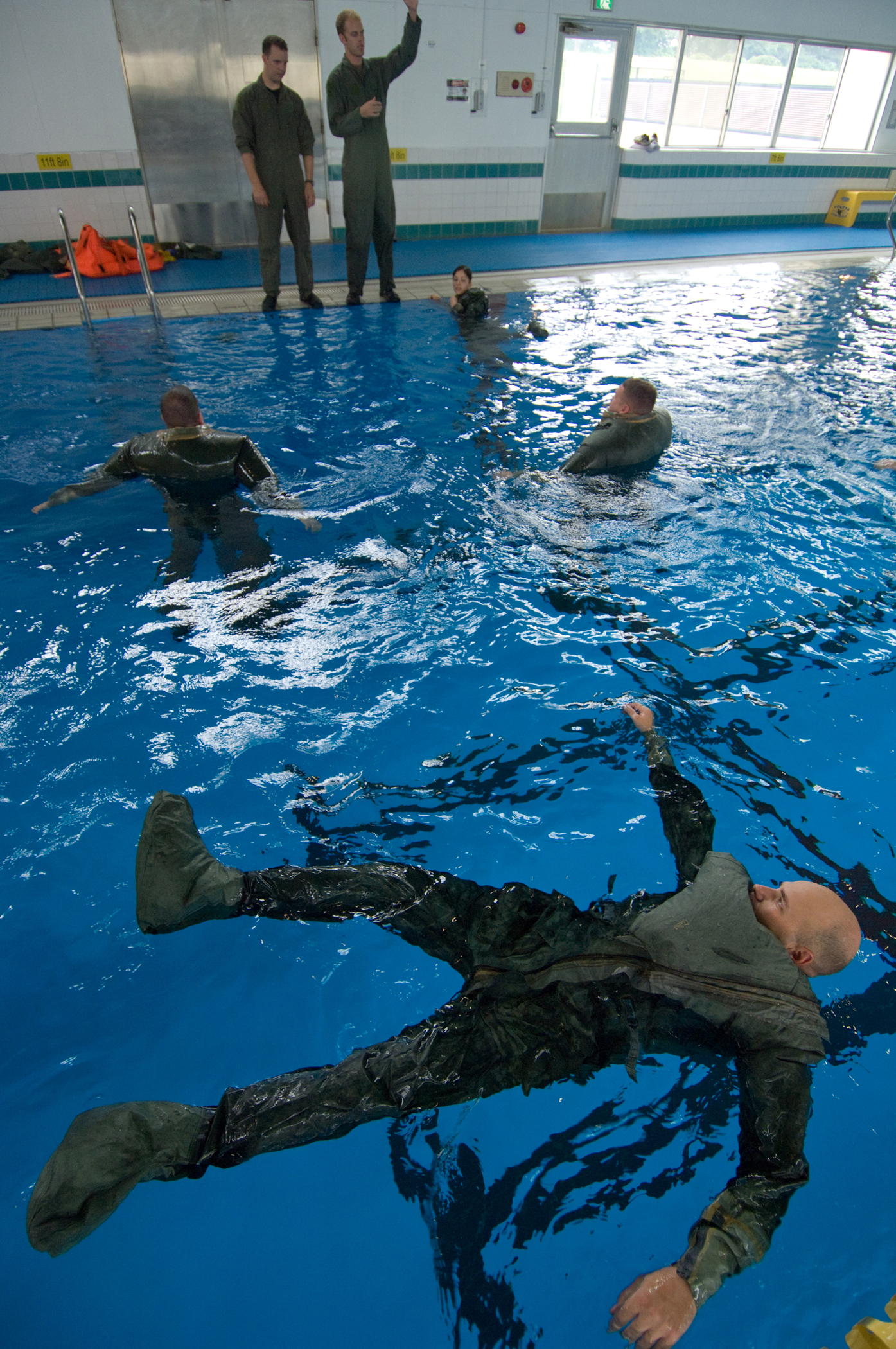Aircrew members take part in the refresher water survival training Sept. 8 in the base pool at Yokota Air Base, Japan. Maj. Daniel Cordes, 374th Airlift Wing, wears a life preserver unit and floats in the water to make sure the gear properly works. (U.S. Air Force photo/Osakabe Yasuo)