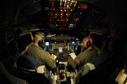 HICKAM AIR FORCE BASE, Hawaii -- Pilots go over their checklist before starting their approach to Hickam Air Force Base, Hawaii Dec. 15, 2005. The KC-135 Extender pilots are from the 74th Air Refueling Squadron, Grissom Air Force Reserve Base, Indiana. (U.S. Air Force photo by Tech. Sgt. Shane A. Cuomo)