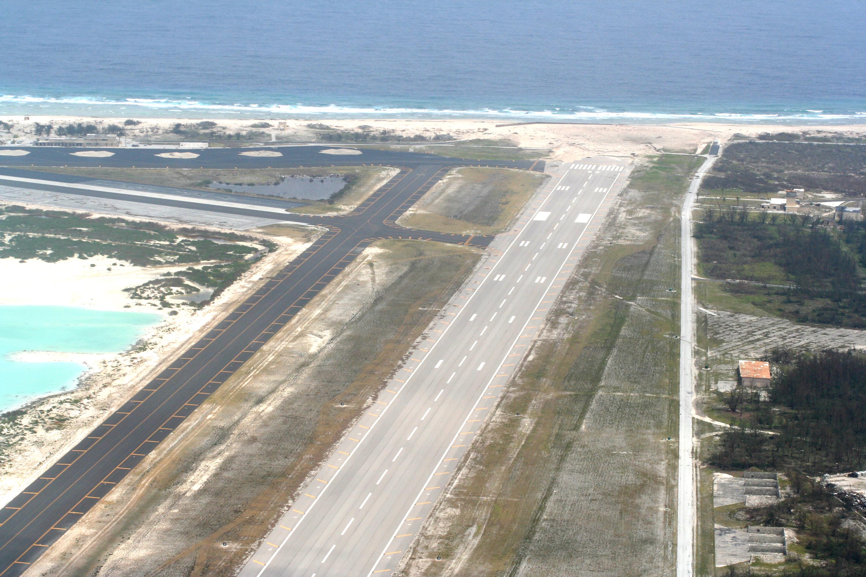 A Coast Guard flyover of Wake Island Sept. 2 shows little apparent damage from Super Typhoon Ioke around the runway and taxiway, officials said. (U.S. Coast Guard photo)