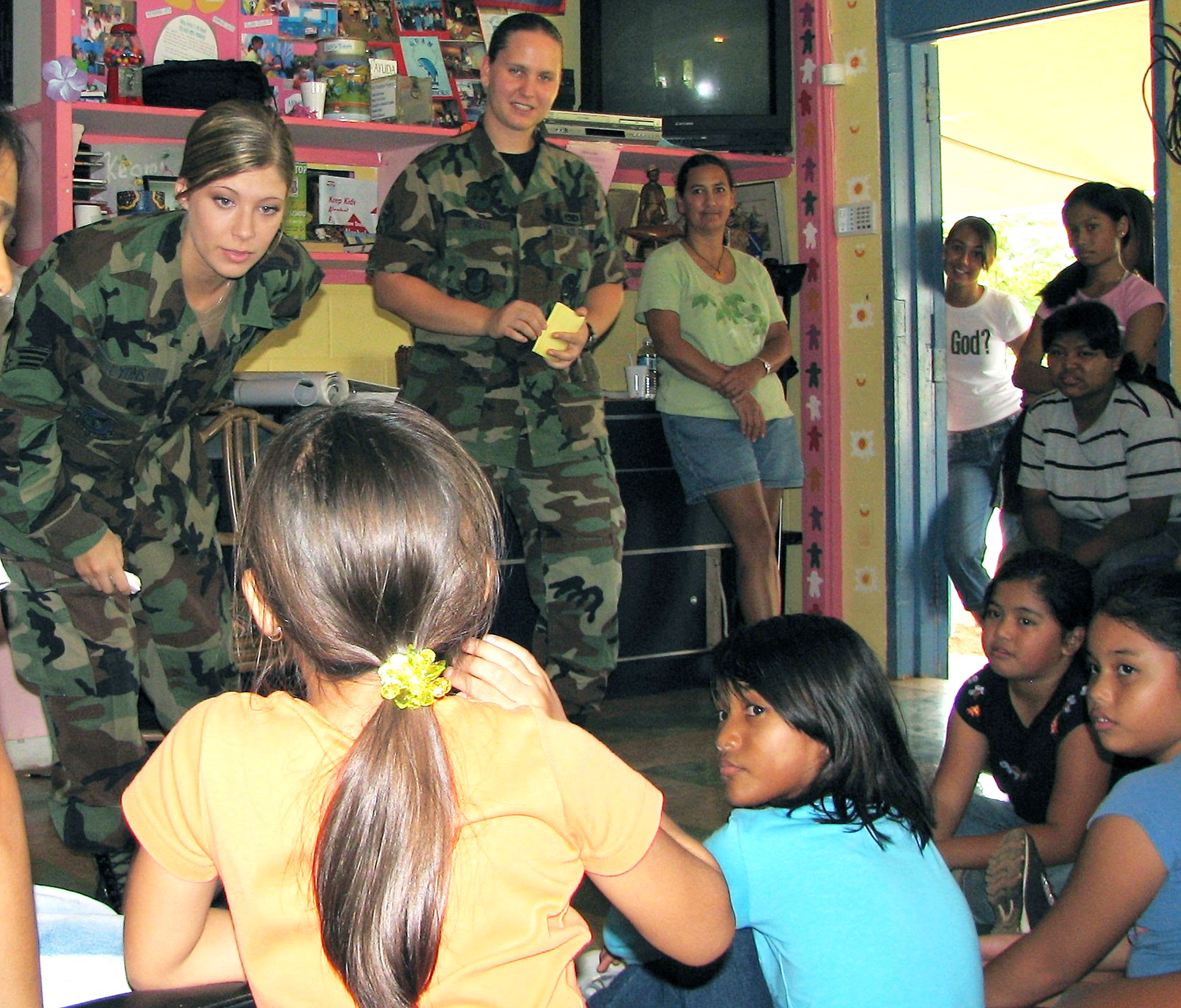 Senior Airman Sarah Lyons (left) and Airman 1st Class Ann Deveci listen to a question during a visit to Guam's Island Girl Power event Aug. 19 near Andersen Air Force Base. The Airmen spoke to more than 20 girls, ages 7 to 14, about the Air Force. Island Girl Power is a nonprofit organization aimed at improving girls' lives with activities and positive female role models in the community. The Airmen are assigned to the 90th Expeditionary Aircraft Maintenance Unit. (U.S. Air Force photo/Tech. Sgt. Mikal Canfield)