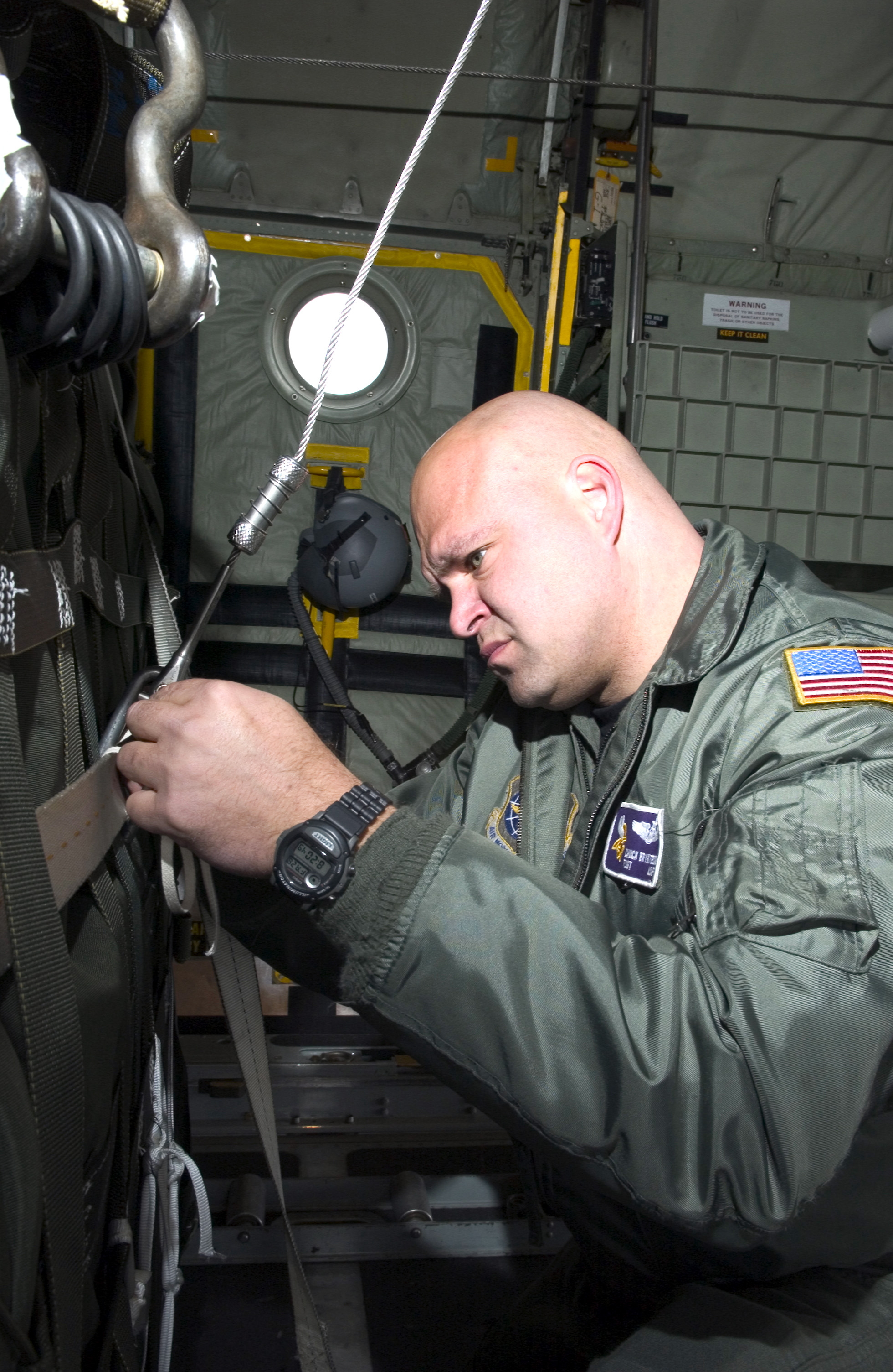 Tech. Sgt. Chuck Brynteson secures container delivery systems in a C-130 Hercules at Elmendorf Air Force Base, Alaska, as part of Red Flag-Alaska 06-2 exercises on Friday, April 28, 2006. Sergeant Brynteson is with the 96th Airlift Squadron at Minneapolis-St. Paul Joint Air Reserve Station, Minn. (U.S. Air Force photo/Senior Airman Garrett Hothan)