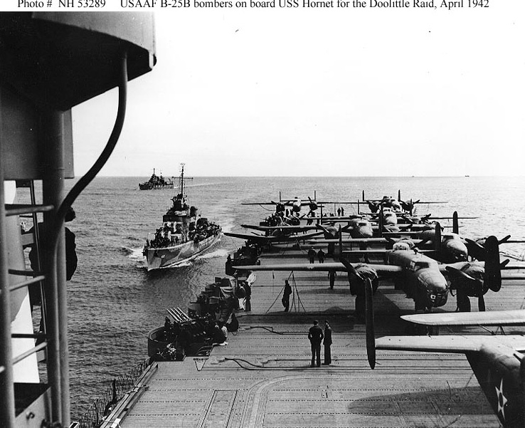 View looking aft from the island of USS Hornet (CV-8), while en route to the mission's launching point. USS Gwin (DD-433) is coming alongside, as USS Nashville (CL-43) steams in the distance. Eight of the mission's 16 B-25B bombers are parked within view, as are two of the ship's scout bombers. Note arresting gear and flight deck barriers in the lower portion of the photo, and 1.1" quad anti-aircraft machine gun mount at left. (U.S. Navy photo)