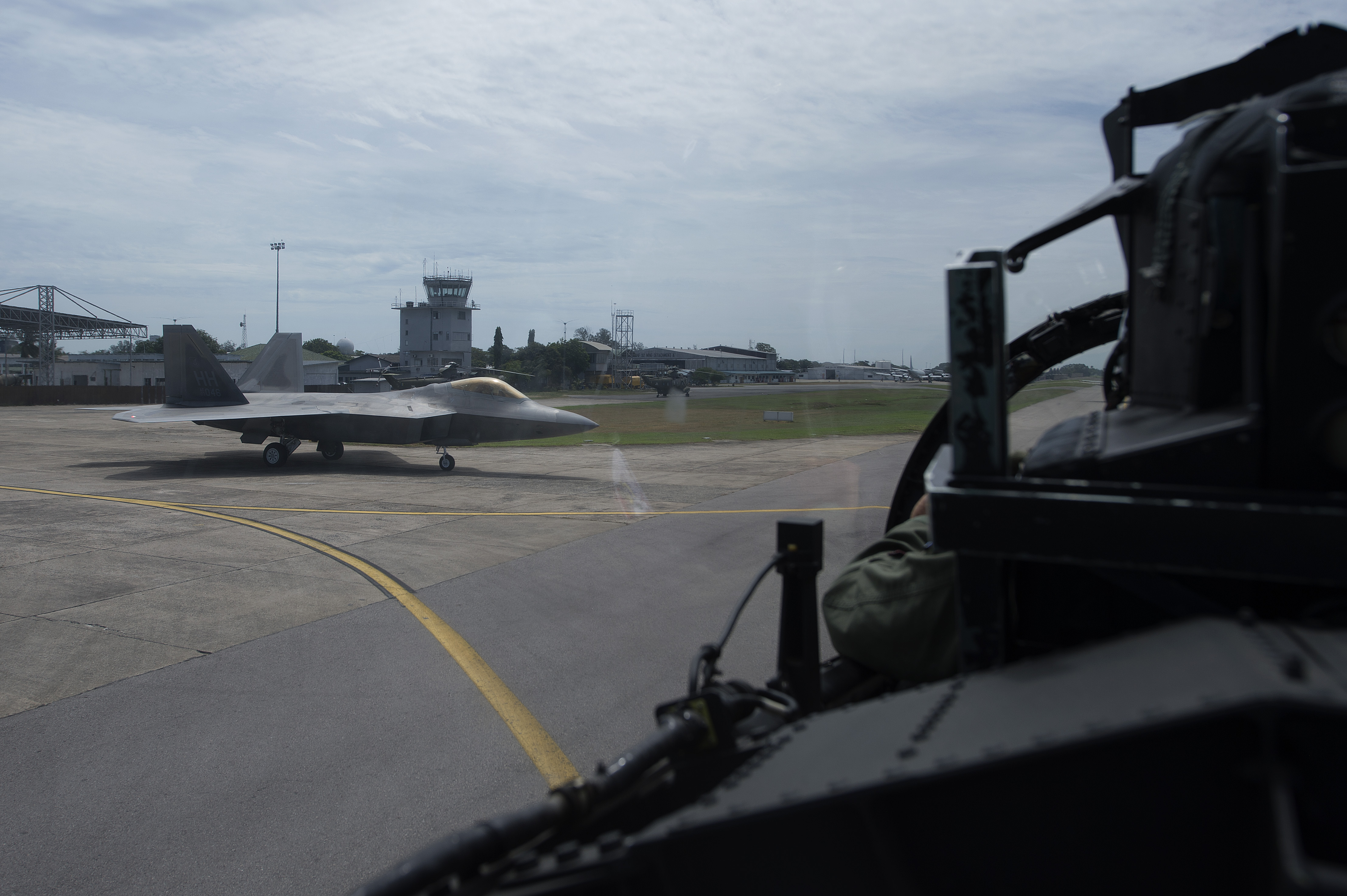 A U.S. Air Force F-22 Raptor from the 154th Wing, Joint Base Pearl Harbor-Hickam, Hawaii, and U.S. Air Force F-15 Eagle from the 131st Fighter Squadron, 104th Fighter Wing, Barnes Air National Guard Base, Mass., prepare to takeoff from Royal Malaysian air force P.U. Butterworth, Malaysia, during Cope Taufan 14, June 16, 2014. Cope Taufan is a biennial large force employment exercise taking place June 9 to 20 designed to improve U.S. and Malaysian combined readiness. (U.S. Air Force photo by Tech. Sgt. Jason Robertson/Released)