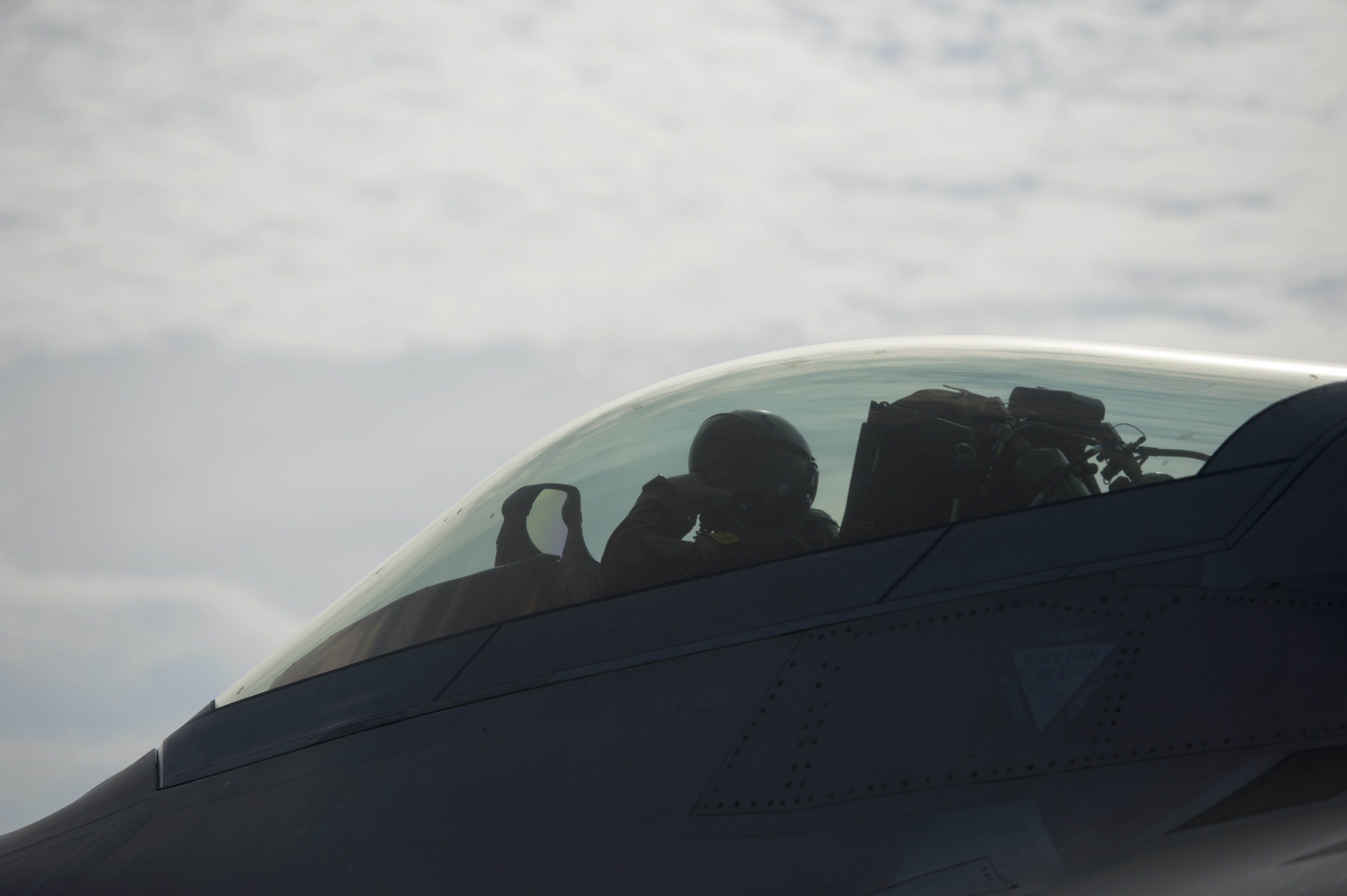 A U.S. Air Force F-22 Raptor pilot from the 154th Wing, Joint Base Pearl Harbor-Hickam, Hawaii, prepares to take off on an exercise sortie during Cope Taufan 14 at Royal Malaysian air force P.U. Butterworth, Malaysia, June 13, 2014. Cope Taufan is a biennial large force employment exercise taking place June 9 to 20 that marks the F-22's first deployment to Southeast Asia. (U.S. Air Force photo by Tech. Sgt. Jason Robertson/Released)