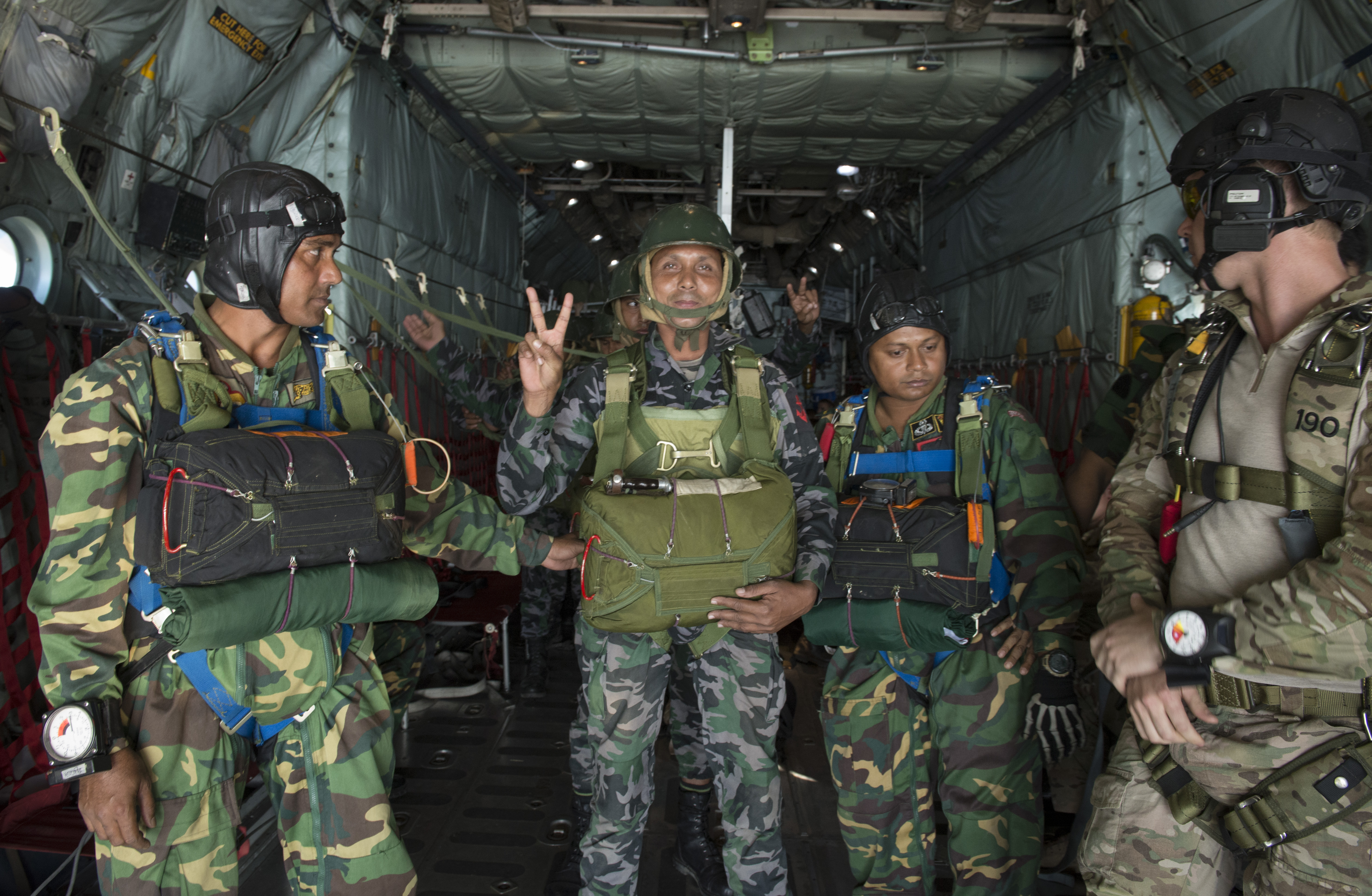 A Bangladeshi paratrooper poses for a photo before a jump aboard an U.S. Air Force C-130 Hercules during exercise Cope South over Bangladesh, Nov. 12, 2013. Cope South gave Bangladeshi and U.S. forces the opportunity to strengthen relations and promote interoperability. (U.S. Air Force photo by Captain Raymond Geoffroy/Released)