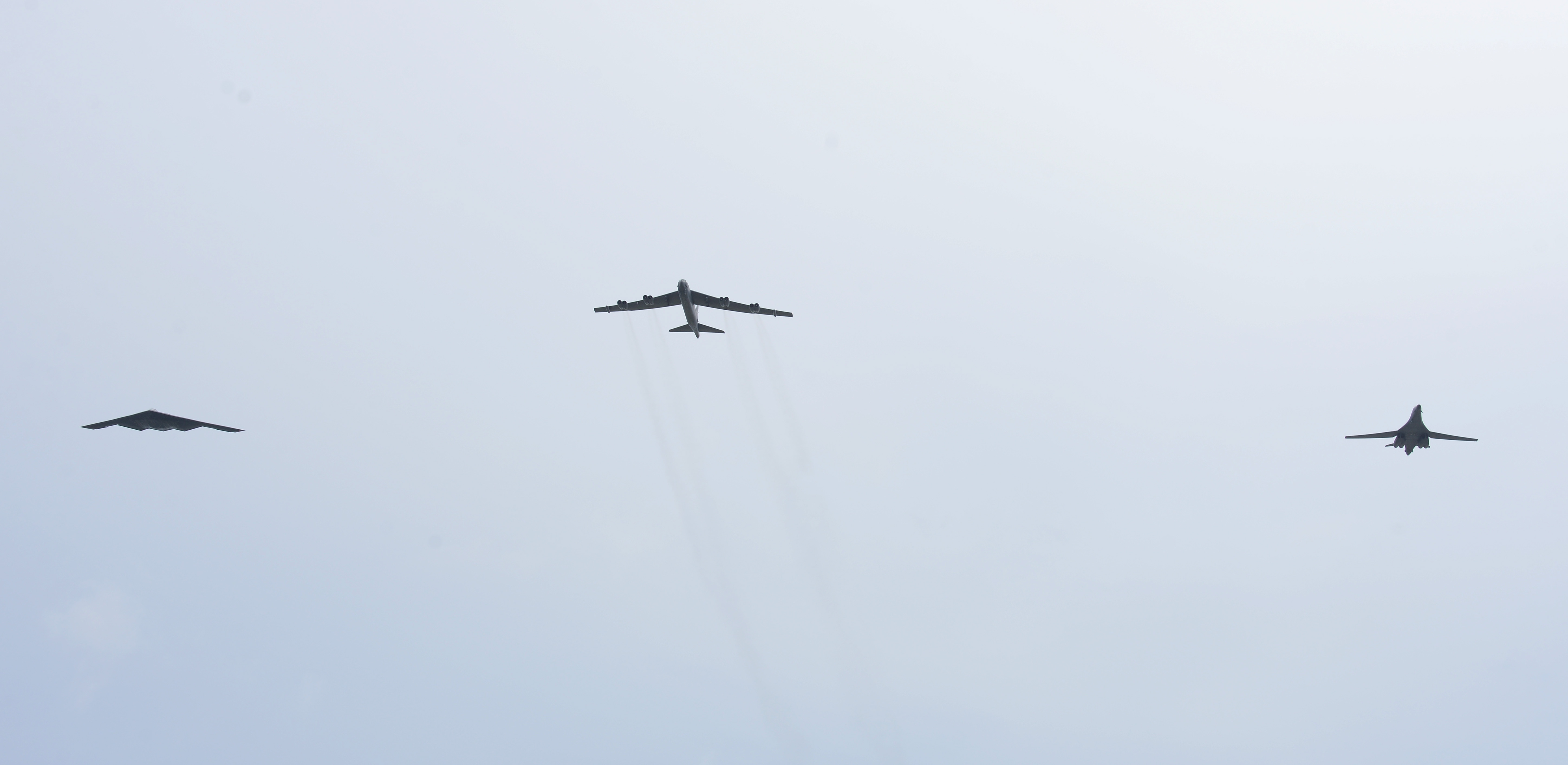 A U.S. Air Force B-52 Stratofortress, B-1 Lancer and B-2 Spirit launch from Andersen Air Force Base, Guam, for an integrated bomber operation Aug.17, 2016. This mission marks the first time in history that all three of Air Force Global Strike Command's strategic bomber aircraft are simultaneously conducting integrated operations in the U.S. Pacific Command area of operations. As of Aug. 15, the B-1 Lancer will be temporarily deployed to Guam in support of U.S. Pacific Command's Continuous Bomber Presence mission. (U.S. Air Force photo by Airman 1st Class Arielle Vasquez/Released)