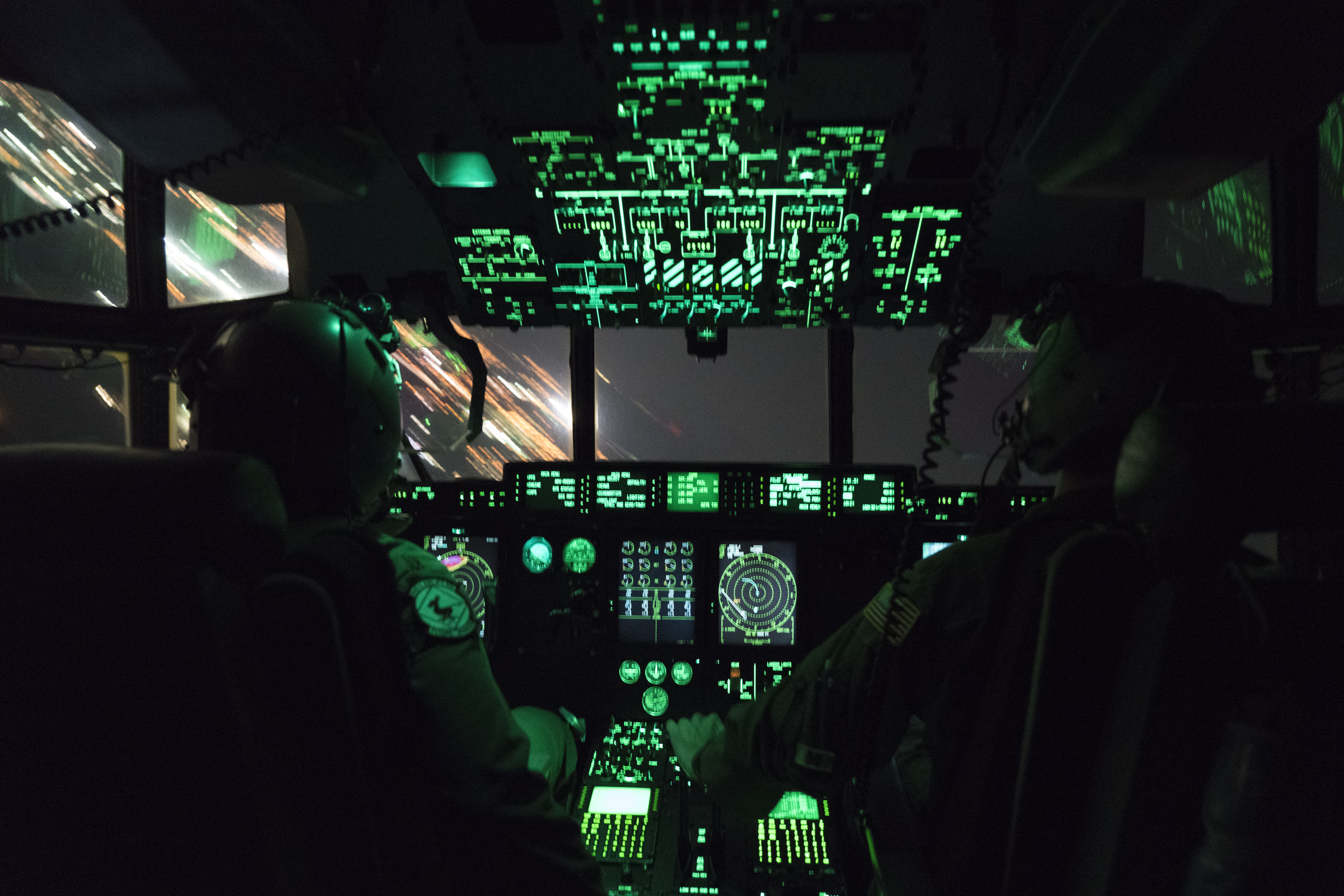 Maj. Nick Foreman (left) and Maj. Chris Bean (right), 815th Airlift Squadron pilots, fly a C-130J Super Hercules aircraft toward Gulfport Combat Readiness Training Center, Miss. Oct. 2, 2019. The 815th AS, aka ‘Flying Jennies,’ with the 327th AS, provided airlift and airdrop support for the U.S. Army’s Joint Forces Exercise Arctic Anvil, Oct. 1 to 6. (U.S. Air Force photo by Tech. Sgt. Christopher Carranza)